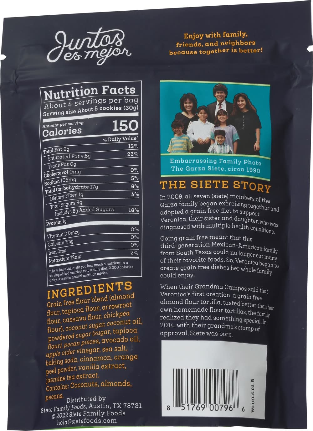 Non-GMO Project verified. nongmoproject.org. Enjoy with family, friends, and neighbors because together is better! Embarrassing family photo The Garza Site, circa 1990. The Site Story: In 2009, all seven (site) members of the Garza family began exercising together and adopted a grain free diet to support Veronica, their sister and daughter, who was diagnosed with multiple health conditions. Going grain free meant that this third-generation Mexican-American family from South Texas could no longer eat many of their favorite foods. So, Veronica began to create grain free dishes her whole family could enjoy. When their Grandma Campos said that Veronica's first creation, a grain free almond flour tortilla, tasted better than her own homemade flour tortillas, the family realized they had something special. In 2014, with their grandma's stamp of approval. Siete Family Foods, Austin,TX,78731