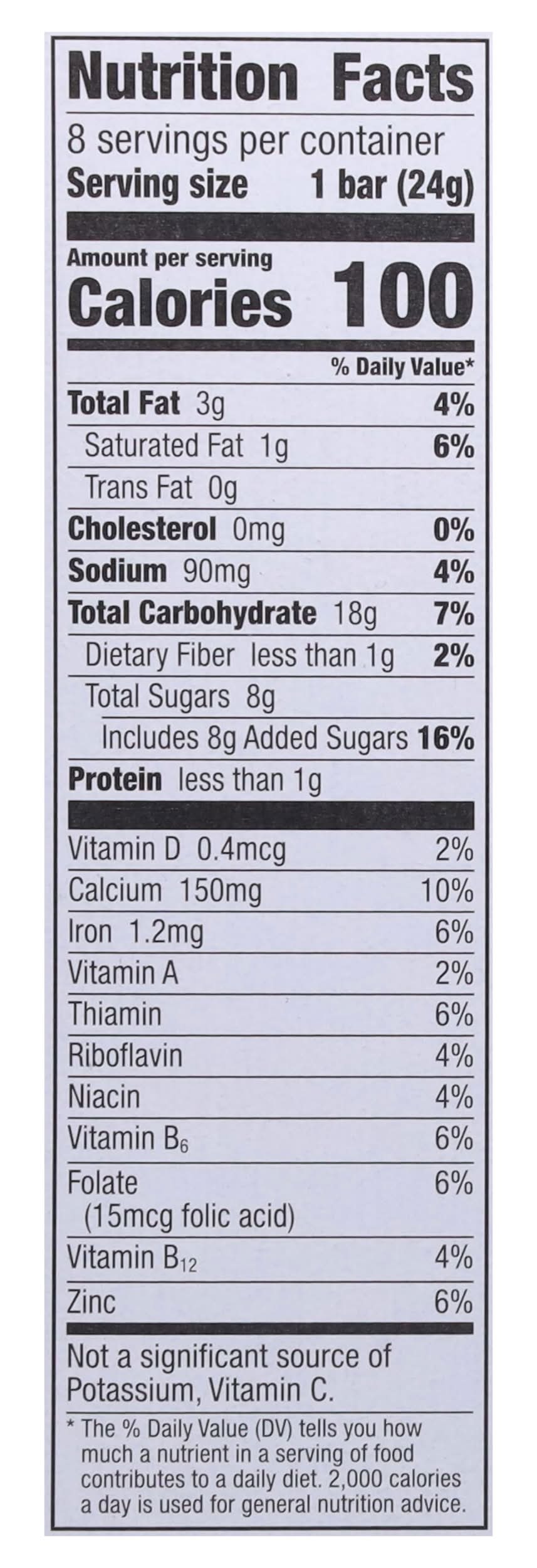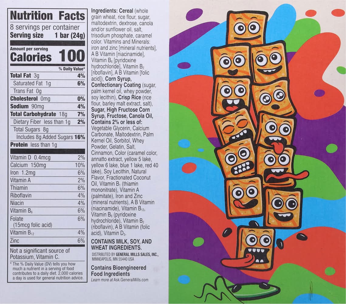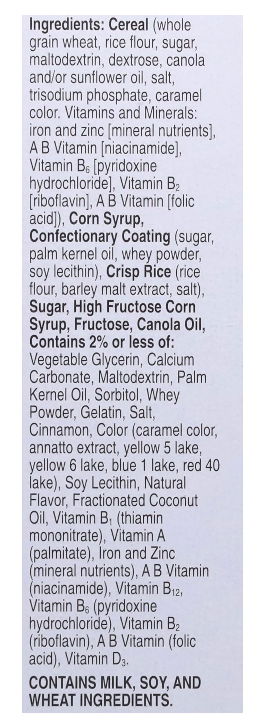 Ingredients: Cereal (Whole Grain Wheat, Rice Flour, Sugar, Maltodextrin, Dextrose, Canola and/or Sunflower Oil, Salt, Trisodium Phosphate, Caramel Color, Vitamins and Minerals: Iron and Zinc [Mineral Nutrients], A B Vitamin [Niacinamide], Vitamin B6 [Pyridoxine Hydrochloride], Vitamin B2 [Riboflavin], A B Vitamin [Folic Acid]), Corn Syrup, Confectionary Coating (Sugar, Palm Kernel Oil, Whey Powder, Soy Lecithin), Crisp Rice (Rice Flour, Barley Malt Extract, Salt), Sugar, High Fructose Corn Syrup, Fructose, Canola Oil, Contains 2% or Less of: Vegetable Glycerin, Calcium Carbonate, Maltodextrin, Palm Kernel Oil, Sorbitol, Whey Powder, Gelatin, Salt, Cinnamon, Color (Caramel Color, Annatto Extract, Yellow 5 Lake, Yellow 6 Lake, Blue 1 Lake, Red 40 Lake), Soy Lecithin, Natural Flavor, Fractionated Coconut Oil, Vitamin B1 (Thiamin Mononitrate), Vitamin A (Palmitate), Iron and Zinc (Mineral Nutrients), A B Vitamin (Niacinamide), Vitamin B12, Vitamin B6 (Pyridoxine Hydrochloride), Vitamin B2 (Riboflavin), A B Vitamin (Folic Acid), Vitamin D3 Contains: Milk, Soybeans, Wheat, Corn, Barley, Tree Nuts, Coconuts