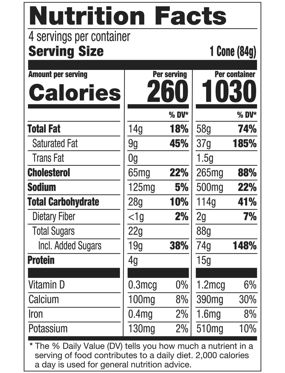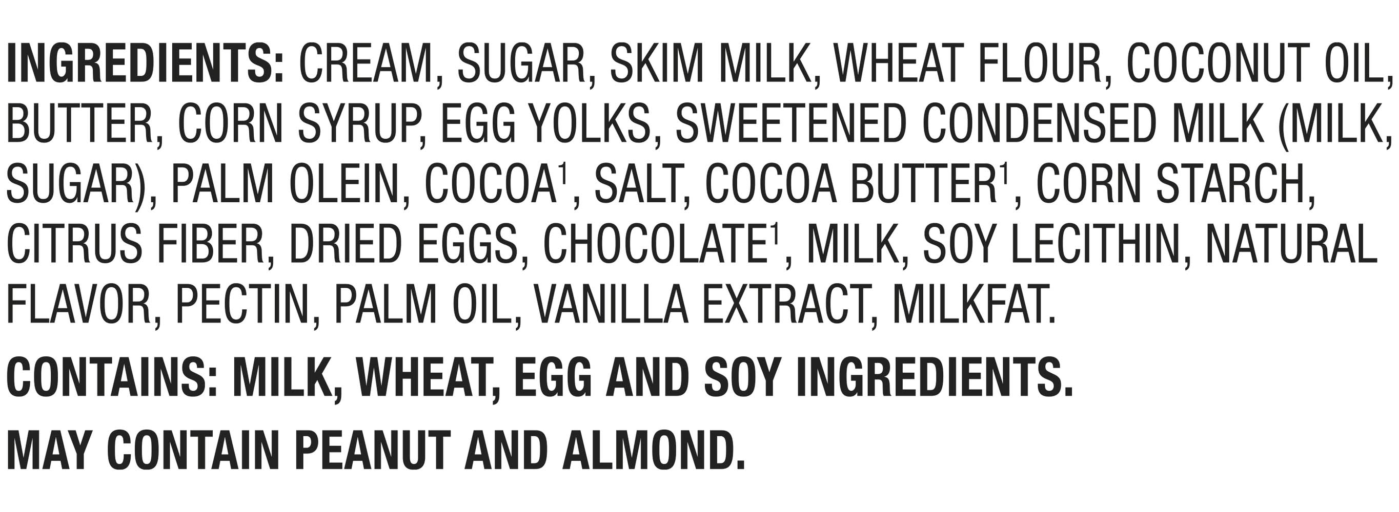 Ingredients: Vanilla Ice Cream: Cream, Skim Milk, Sugar, Egg Yolks, Vanilla Extract, Milk Chocolate and Vegetable Oil Coating: Milk Chocolate (Sugar, Whole Milk Powder, Chocolate, Cocoa Butter, Soy Lecithin, Vanilla Extract), Coconut Oil, Caramel Variegate: Corn Syrup, Sweetened Condensed Milk (Condensed Milk, Sugar), Cream, Sugar, Water, Butter (Cream, Salt), Salt, Pectin, Soy Lecithin, Waffle Cone Pieces: Wheat Flour, Sugar, Soybean Oil, Soy Lecithin, Salt Contains: Milk, Eggs, Wheat, Soybeans, Tree Nuts, Coconuts, Corn, Tree Nuts