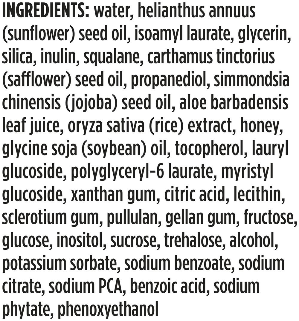 Ingredients: Water, helianthus annuus (sunflower) seed oil, isoamyl laurate, glycerin, silica, inulin, squalane, carthamus tinctorius (safflower) seed oil, propanediol, simmondsia chinensis (jojoba) seed oil, aloe barbadensis leaf juice, oryza sativa (rice) extract, honey, glycine soja (soybean) oil, tocopherol, lauryl glucoside, polyglyceryl-6 laurate, myristyl glucoside, xanthan gum, citric acid, lecithin, sclerotium gum, pullulan, gellan gum, fructose, glucose, inositol, sucrose, trehalose, alcohol, potassium sorbate, sodium benzoate, sodium citrate, sodium PCA, benzoic acid, sodium phytate, phenoxyethanol