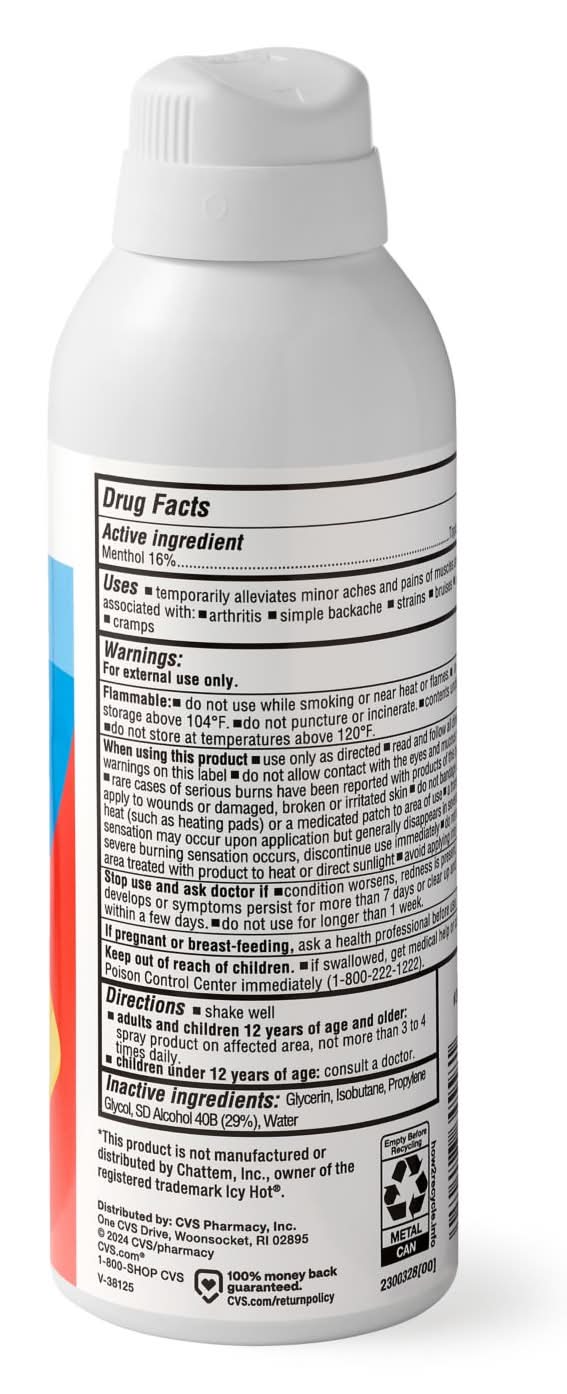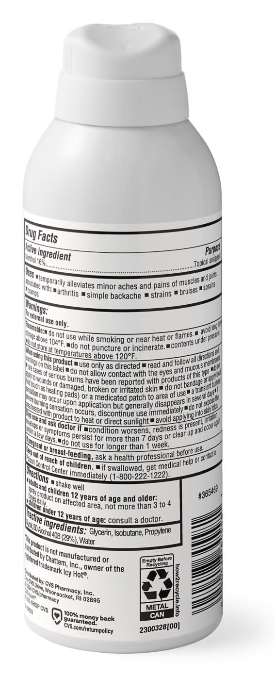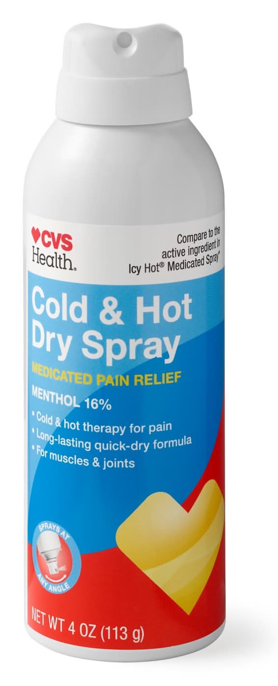 Medicated pain relief spray Formulated with 16% menthol Cold and hot therapy for pain CVS Health quality 4-oz. Get relief from aching, painful muscles and joints with CVS Health Cold & Hot Dry Spray Medicated Pain Relief. This convenient medicated pain relief spray is formulated with 16% menthol to create a soothing, cooling sensation. It provides cold and hot therapy for common aches and pains of the muscles and joints. The long-lasting formula is quick drying, so it's easy to use and take with you whenever you're on the go. This product is for external use only and should not be used on the mucous membranes or the eye area. Use this product carefully as directed per the product packaging. This handy spray will provide you with long-lasting relief from minor aches and pains. If your pain persists, contact your doctor or another healthcare professional to get a diagnosis and treatment. To use the spray, shake the bottle well and apply it directly to the affected area no more than three to four times daily. This product is intended for adults and children ages 12 and older. At CVS Health, we are passionate advocates for transforming health care into a more personalized experience through new technologies and innovations that can help improve the quality of your everyday life.
