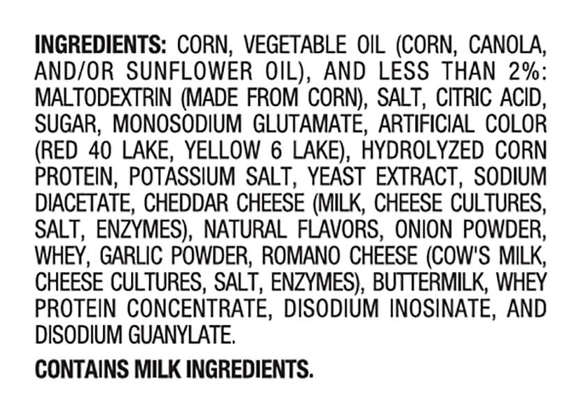 Ingredients: Corn, Vegetable Oil (Corn, Canola, and/or Sunflower Oil), and Less than 2%: Maltodextrin (Made from Corn), Salt, Citric Acid, Sugar, Monosodium Glutamate, Artificial Color (Red 40 Lake, Yellow 6 Lake), Hydrolyzed Corn Protein, Potassium Salt, Yeast Extract, Sodium Diacetate, Cheddar Cheese (Milk, Cheese Cultures, Salt, Enzymes), Natural Flavors, Onion Powder, Whey, Garlic Powder, Romano Cheese (Cow's Milk, Cheese Cultures, Salt, Enzymes), Buttermilk, Whey Protein Concentrate, Disodium Inosinate, and Disodium Guanylate. Contains: Milk, Corn