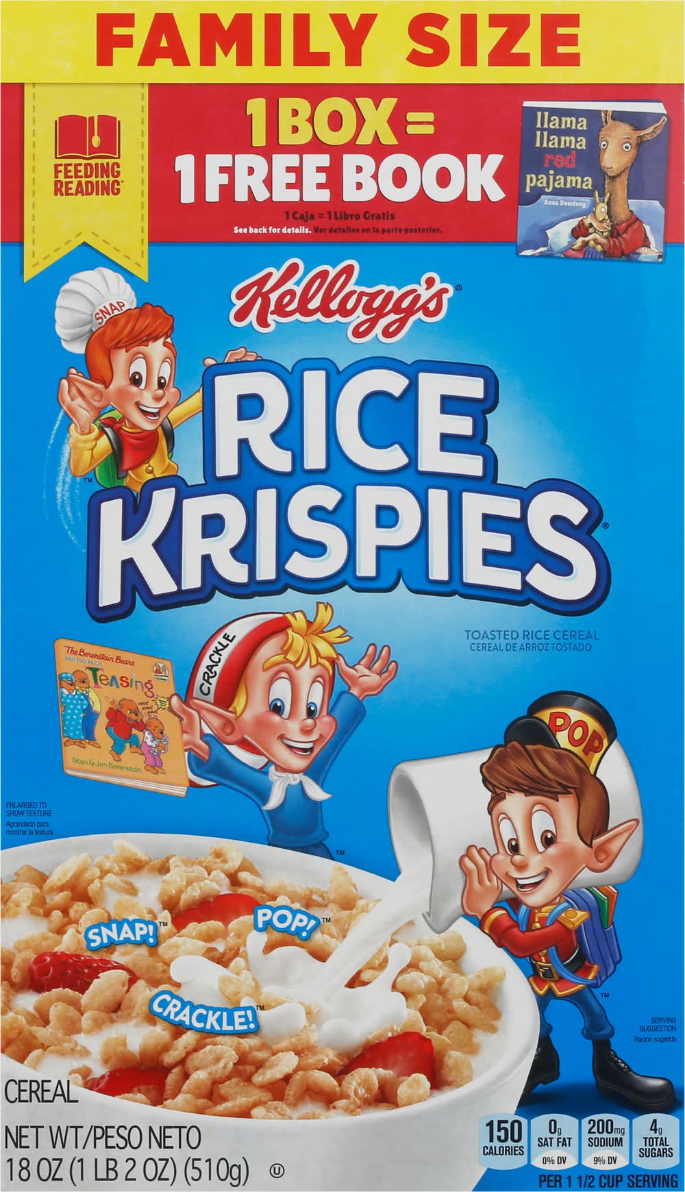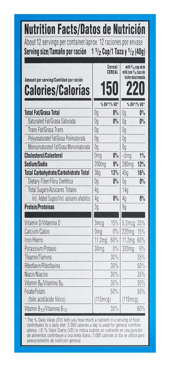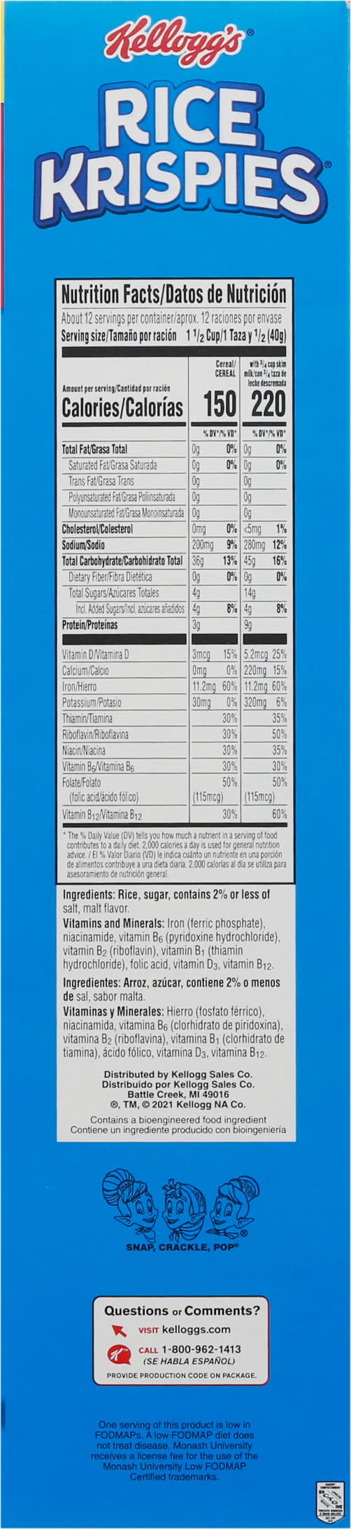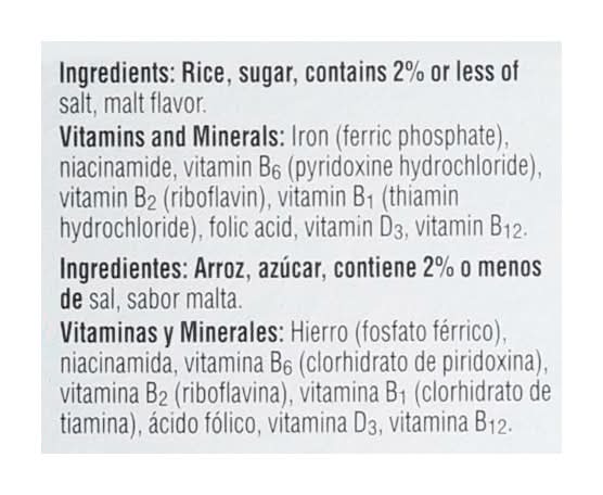 Ingredients: Rice, Sugar, Contains 2% or Less of Salt, Malt Flavor. Vitamins and Minerals: Iron (Ferric Phosphate), Niacinamide, Vitamin B6 (Pyridoxine Hydrochloride), Vitamin B2 (Riboflavin), Vitamin B1 (Thiamin Hydrochloride), Folic Acid, Vitamin D3, Vitamin B12