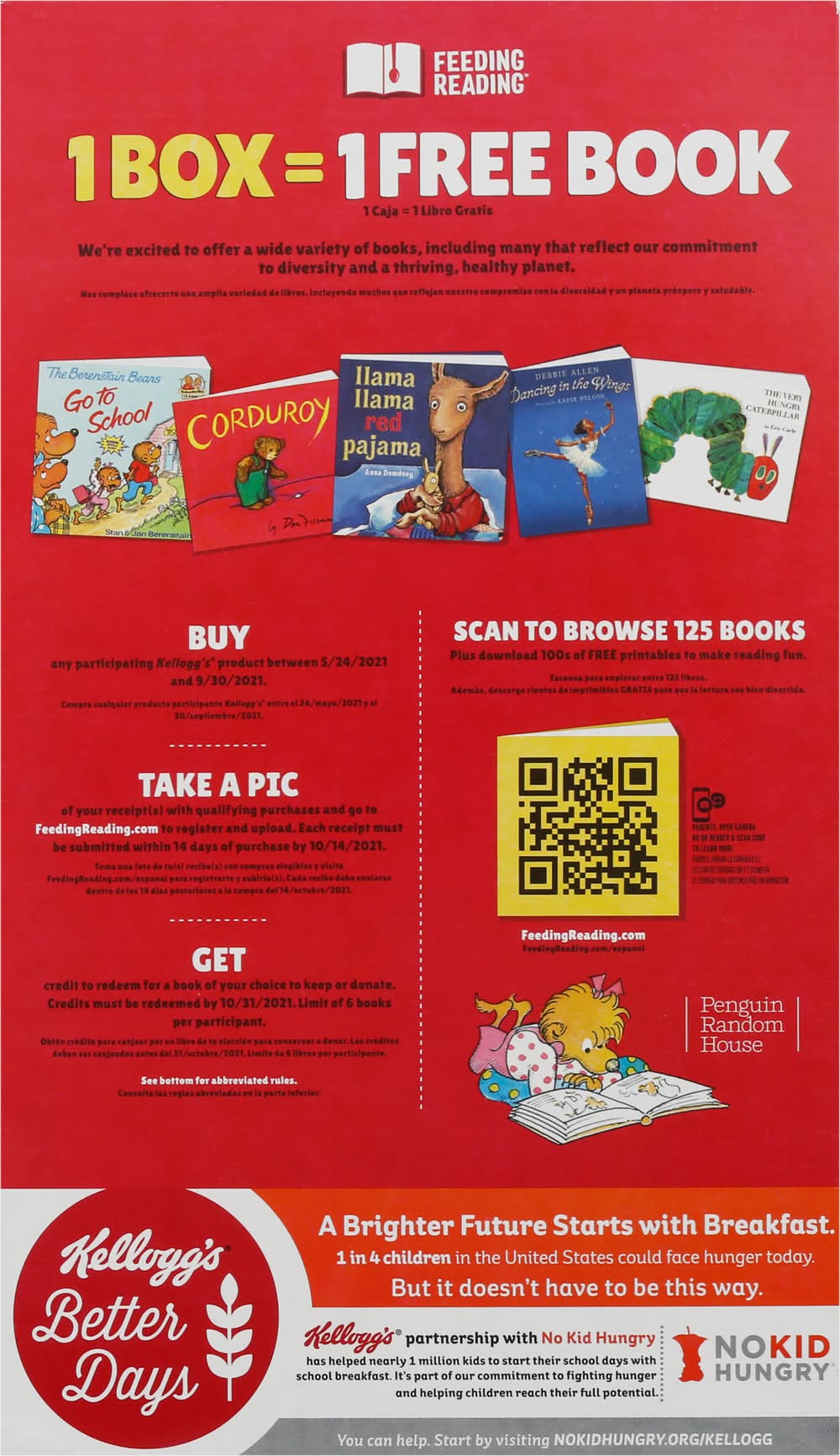 A brighter future starts with breakfast. 1 in 4 children in the united states could face hunger today. But it doesn't have to be this way. Provide production code on package. One serving of this product is low in fodmaps. A low fodmap diet does not treat disease. Monash university receives a license fee for the use of the monash university low fodmap certified trademarks. Kellogg's better days: a brighter future starts with breakfast. 1 in 4 children in the united states could face hunger today. But it doesn't have to be this way. Kellogg's partnership with no kid hungry has helped nearly 1 million kids to start their school days with school breakfast. It's part of our commitment to fighting hunger and helping children reach their full potential. No kid hungry. • Kellogg sales co., Battle Creek , MI ,49016 • Packaging: Reusable