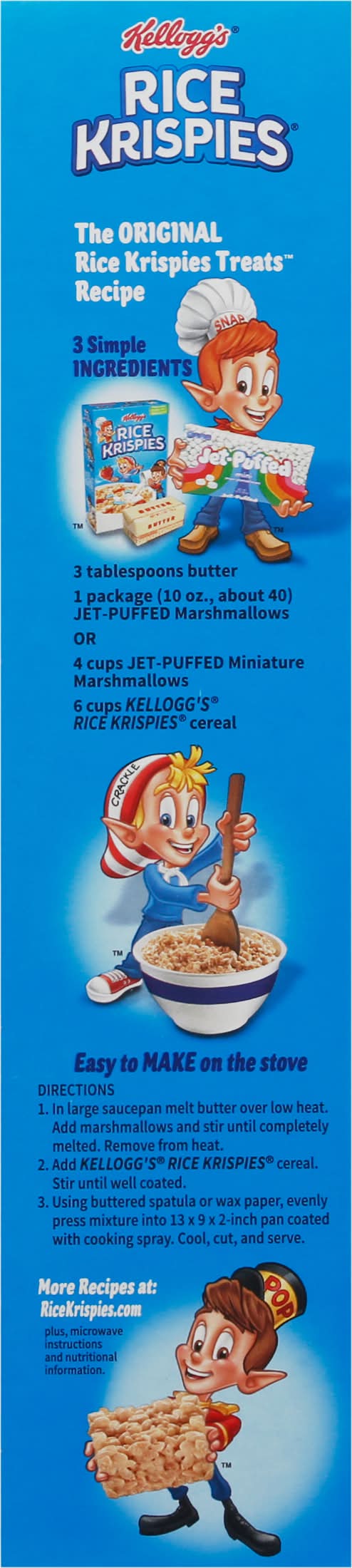 Directions: easy to make on the stove: directions: 1. in large saucepan melt butter over low heat.= add marshmallows and stir until completely melted. remove from heat. 2. add kellogg's rice krispies cereal. stir until well coated. 3. using buttered spatula or wax paper, evenly press mixture into 13 x 9 x 2-inch pan coated with cooking spray. cool, cut, and serve. the original rice krispies treats: 3 simple ingredients: 3 tablespoon butter. 1 package (10 oz., about 40) jet-puffed marshmallows or 4 cups jet-puffed miniature marshmallows. 6 cups kellogg's rice krispies cereal. lift tab to open.