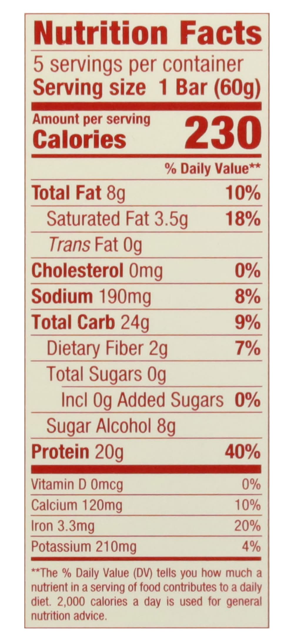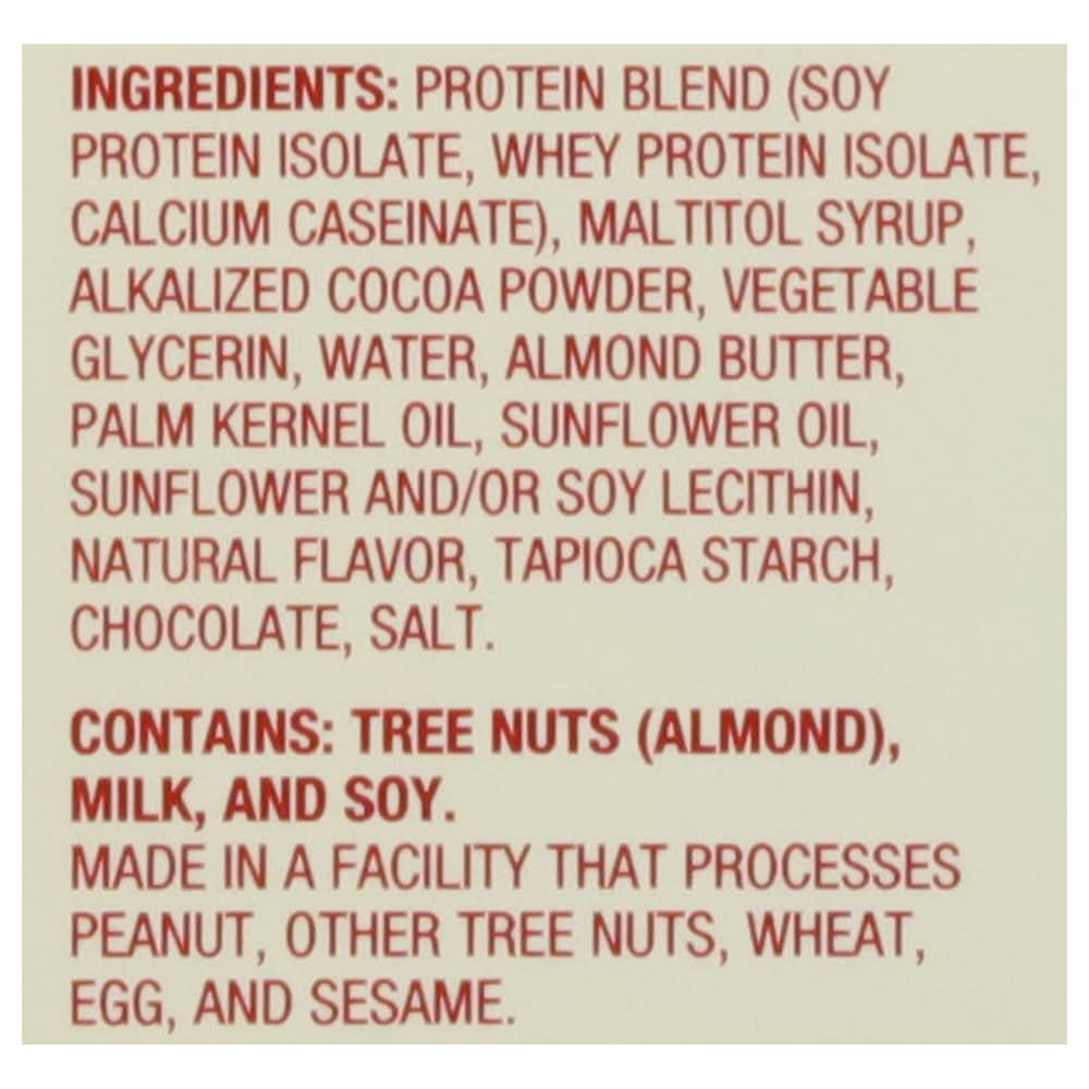 Ingredients: Protein Blend (Soy Protein Isolate, Whey Protein Isolate, Calcium Caseinate), Maltitol Syrup, Alkalized Cocoa Powder, Vegetable Glycerin, Water, Almond Butter, Palm Kernel Oil, Sunflower Oil, Sunflower and/or Soy Lecithin, Natural Flavor, Tapioca Starch, Chocolate, Salt Contains: Tree Nuts, Almonds, Milk, Soybeans, Peanuts, Tree Nuts, Wheat, Eggs, Sesame