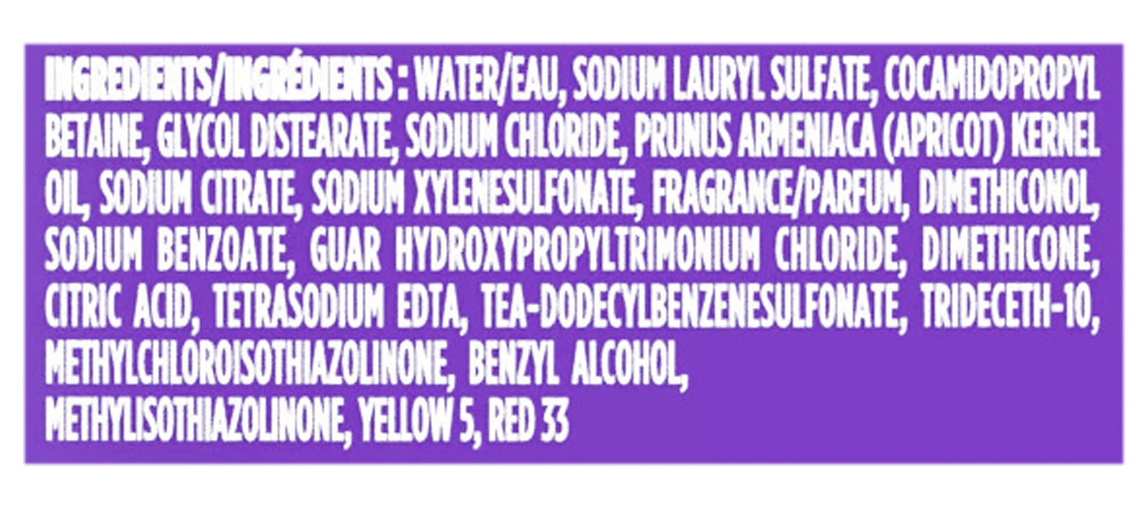 Ingredients: Water/Eau, Sodium Lauryl Sulfate, Cocamidopropyl Betaine, Glycol Distearate, Sodium Chloride, Prunus Armeniaca (Apricot) Kernel Oil, Sodium Citrate, Sodium Xylenesulfonate, Fragrance/Parfum, Dimethiconol, Sodium Benzoate, Guar Hydroxypropyltrimonium Chloride, Dimethicone, Citric Acid, Tetrasodium EDTA, TEA-Dodecylbenzenesulfonate, Trideceth-10, Methylchloroisothiazolinone, Benzyl Alcohol, Methylisothiazolinone, Yellow 5, Red 33 Contains: Tree Nuts