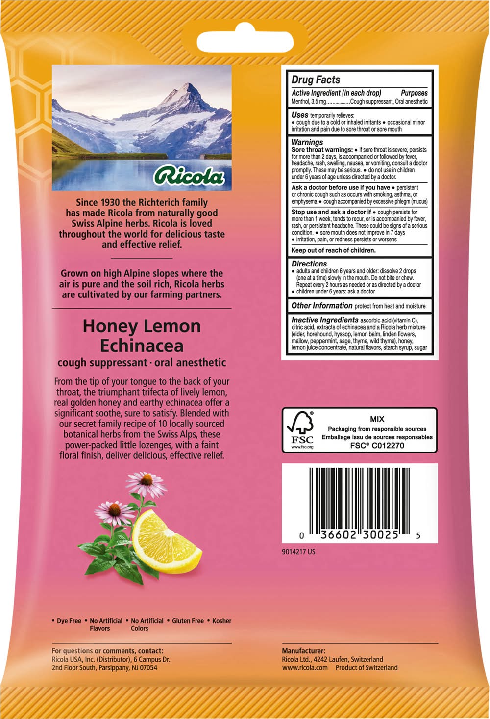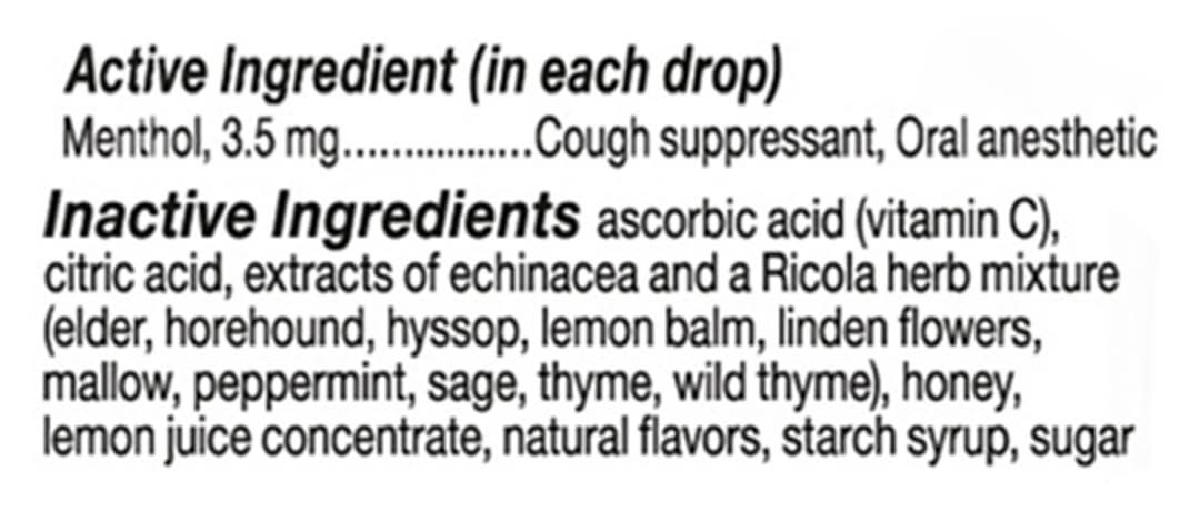 Ingredients: (in each drop) Active Ingredients: Menthol (3.5 mg), Cough Suppressant, Oral Anesthetic. Inactive Ingredients: Ascorbic Acid (Vitamin C), Citric Acid, Extracts of Echinacea and a Ricola Herb Mixture (Elder, Horehound, Hyssop, Lemon Balm, Linden Flowers, Mallow, Peppermint, Sage, Thyme, Wild Thyme), Honey, Lemon Juice Concentrate, Natural Flavors, Starch Syrup, Sugar