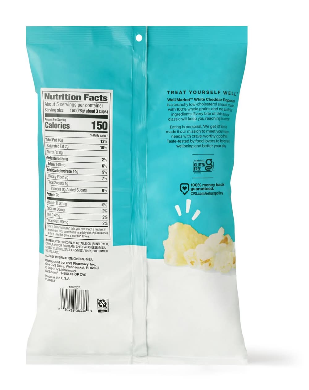Well Market™ White Cheddar Popcorn is a crunchy low-cholesterol snack made with 100% whole grains and no artificial ingredients. Every bite of this savory classic will keep you reaching for more! Eating is personal. We get it! So we've made it our mission to meet your wellness needs with crave-worthy goodness. Taste-tested by food lovers to boost your wellbeing and better your day. Good source of fiber 50 calories per cup Non-GMO Gluten Free