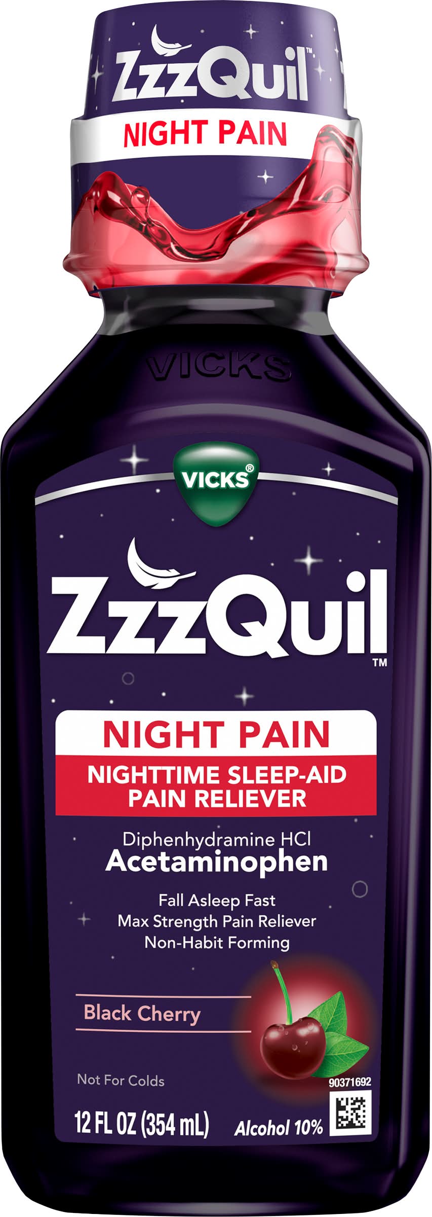 When you’re having trouble getting that sound sleep you need and have aches and pains keeping you up, add some Zzzs to your night with ZzzQuil Night Pain Nighttime Sleep Aid Pain Reliever. This ZzzQuil sleep aid works to help you fall asleep fast so you can get sleep when you need it and wake refreshed. All ZzzQuil sleep aid products are non-habit forming and specifically formulated with clinically proven ingredients by our team of dedicated scientists. This non-habit-forming sleep aid helps you fall asleep fast, so you can wake up feeling refreshed. ZzzQuil Night Pain Nighttime Sleep Aid is formulated with 1000mg acetaminophen and 50mg diphenhydramine HCI, per dose. Use ZzzQuil Night Pain Sleep Aid for the Sound Sleep you want and the Pain Relief you need. ZzzQuil is the World’s #1 Sleep Aid Brand!† Explore ZzzQuil’s range of products to help you fall asleep, including our line of ZzzQuil PURE Zzzs Melatonin products. †Source Euromonitor International Limited; Consumer Health 2024 Edition; Sleep Aids, all channels, retail selling price, Global Brand Name ZzzQuil 2023 data‡ Maximum strength dose of active ingredients per dosing interval, only use as directed. SLEEP FOR WHEN PAIN KEEPS YOU UP: ZzzQuil Liquid Sleep Aid Night Pain is for the Sound Sleep you want and the Pain Relief you need FALL ASLEEP FAST: ZzzQuil Night Pain helps you fall fast so you can get sleep when you need it and wake refreshed MAX STRENGTH PAIN RELIEF‡: This Night Pain ZzzQuil Sleep Aid contains 1000mg acetaminophen and 50mg diphenhydramine HCI, so you can fall asleep fast and wake refreshed NON-HABIT FORMING: ZzzQuil Night Pain Sleep Aid contains non-habit forming ingredients: Diphenhydramine HCI to help you get the sleep you need and Acetaminophen for pain relief NIGHTIME SLEEP AID: Quality sleep is more beneficial than wakeful hours tossing and turning in bed. ZzzQuil has a range of sleep aids for adults and kids to help you fall asleep fast