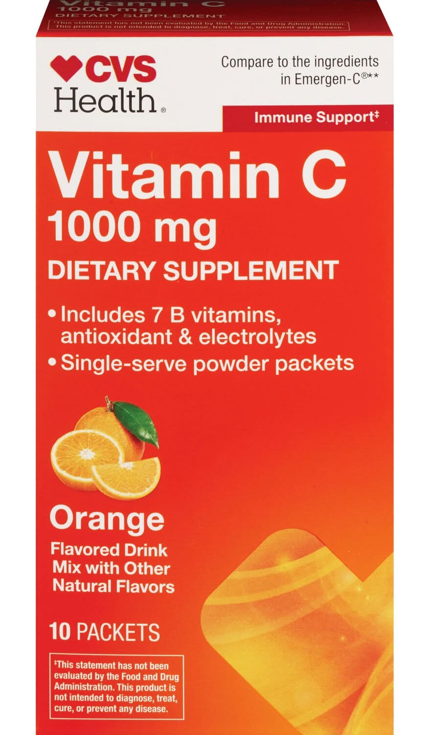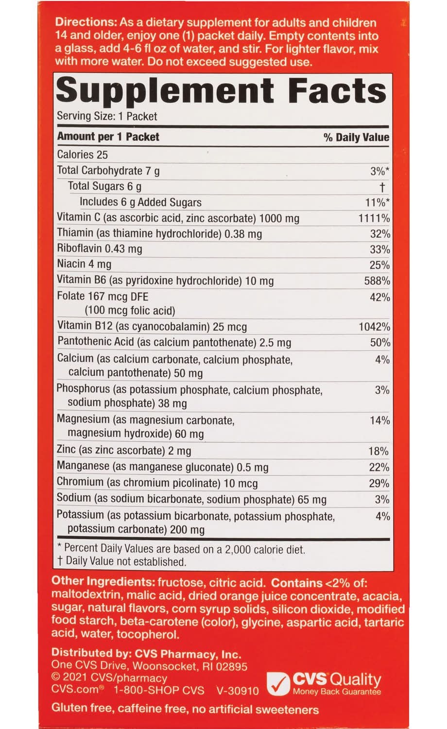 CVS Health Vitamin C 1000 mg Dietary Supplement Packets provide a blend of vitamins and minerals with a focus on supporting immune function. Each single-serve powder packet is designed to be mixed with water to create a fizzy, orange-flavored drink. In addition to vitamin C, the formula includes B vitamins to aid in converting food into energy, and electrolytes to help replenish what is lost during perspiration. Suitable for adults and children over the age of 14, the recommended use is one packet daily dissolved in 4-6 fl oz of water, which can be adjusted for a lighter flavor preference. It is important to consult with a physician before use if pregnant, nursing, taking medication, or dealing with a medical condition. The product should be stored in a cool, dry place away from excessive heat and moisture, and it is vital to keep the packets out of reach of children. Use only if the packet is intact, and do not exceed the suggested daily amount. The product claims regarding health benefits have not been evaluated by the Food and Drug Administration.