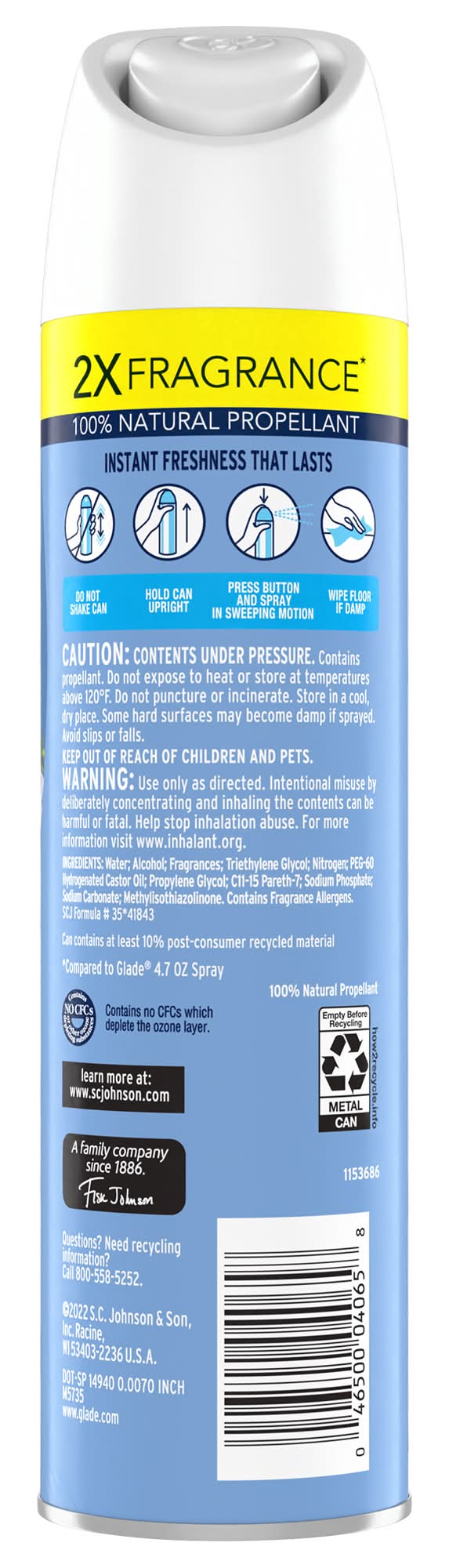 Glade Clean Linen Air Freshener offers an enhanced fragrance experience with twice the scent intensity of its previous 7.6 oz spray formulation. It features odor-fighting technology to provide sustained freshness. The can is manufactured with a minimum of 10% post-consumer recycled material and uses 100% natural propellant. It is free from CFCs and other substances that could deplete the ozone layer. Packaging: Reusable