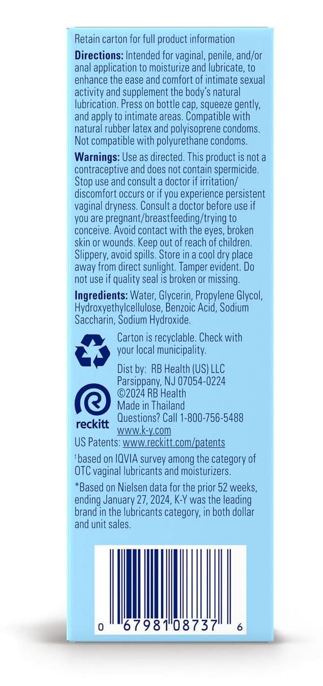 Water-based personal lubricant for wetter sex. The no. 1 doctor recommended brand (based on IQVIA survey among the category of OTC vaginal lubricants and moisturizers). Gentle formula - not made with hormones, parabens, silicone, artificial colorants and fragrances. New body friendly formula that provides longer (in comparison to no lubricant during intercourse) lasting pleasure that complements your natural lubrication. K-Y Ultragel lube is our premium water-based lube that helps supplement your natural lubrication. The unique formula is non-sticky, non-greasy and easily washes off. Say no to discomfort and oh yes to pleasure with an expertly crafted formula that instantly gets you ready to get it on. Exceptional pleasure you can count on. Now we're talking. Texture: Soft and smooth. Compatibility: Toy friendly & condoms (latex & polyisoprene). Benefit: Extra comfort. RB - Health, Hygiene, Home. I'm in the mood for a sliding type of lube. pH-friendly. Your natural lubrication varies but your comfort doesn't have to. Since 1904, K-Y has been empowering women to have better sex always. Body friendly formula. Empty container, carton and label are recyclable. Check with your local municipality. Packaging: Reusable