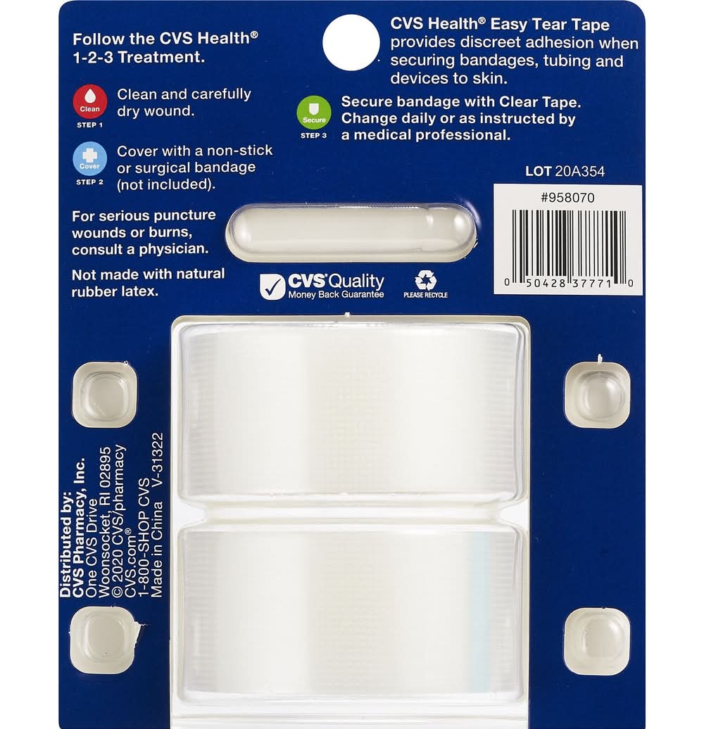 1 in x 10 yd. Breathable. Fully flexible. Tears easily without scissors. CVS/pharmacy clear tape is flexible, breathable and less noticeable while still providing strong adhesion to secure dressing, tubing and devices. This tape is ideal for elbows, fingers, knees and other moving parts. Not made with natural rubber latex. Please recycle. CVS.com. CVS quality. Made in China.