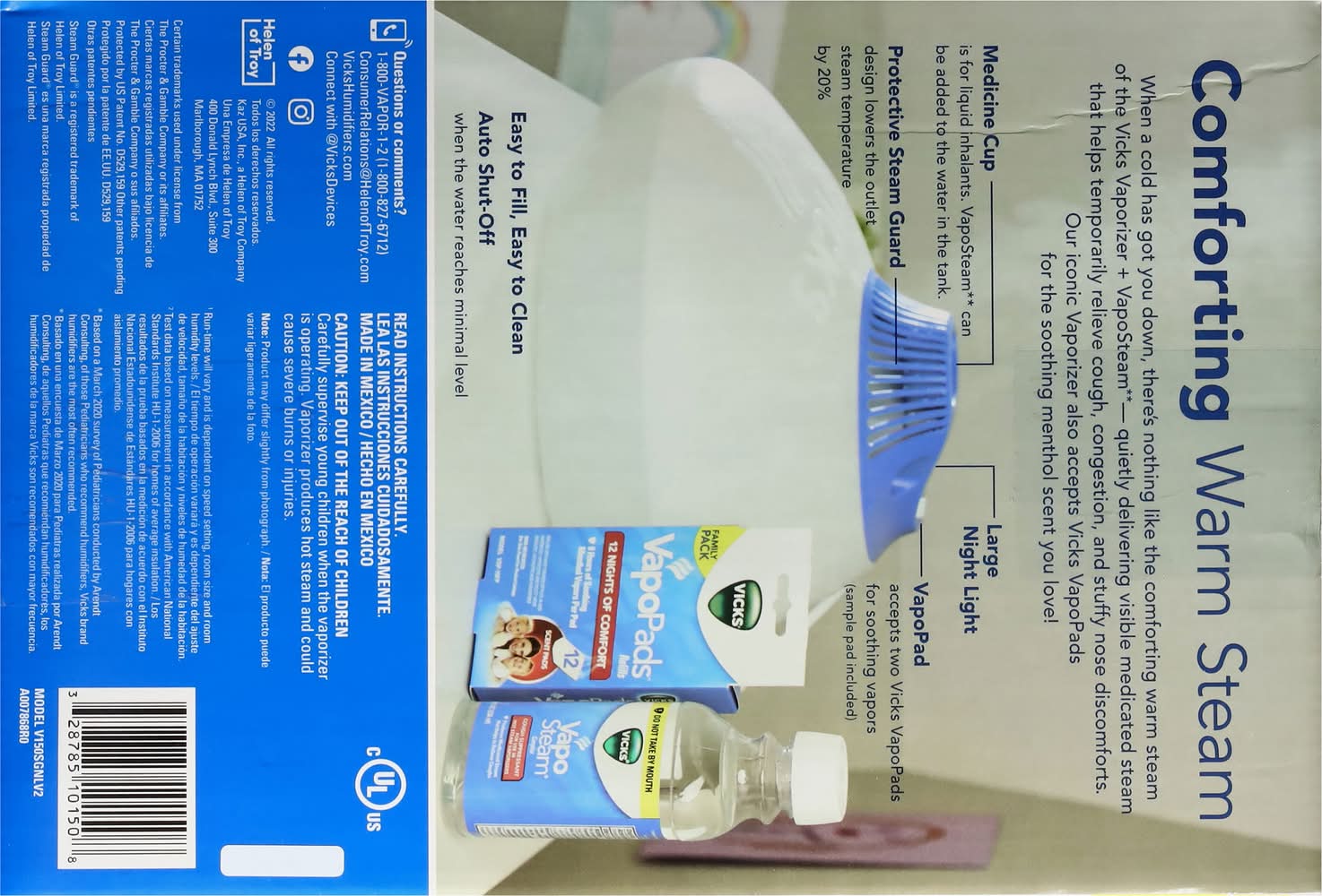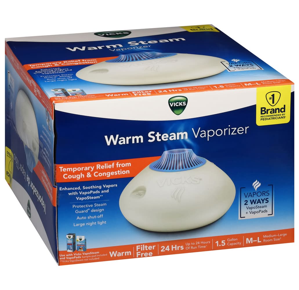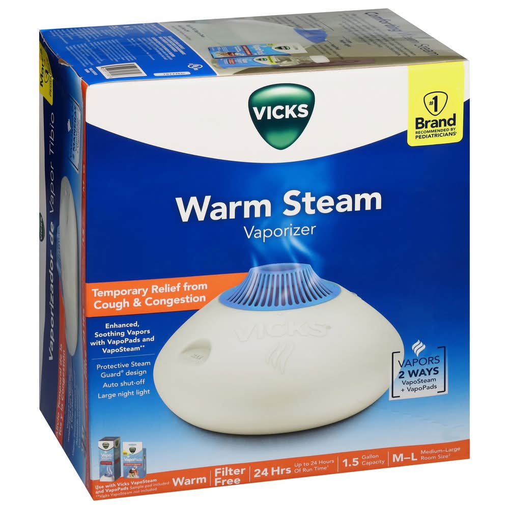 The Vicks Ultrasonic Humidifier quietly produces an ultra-fine visible mist, helping to return essential moisture to dry air for better breathing and a comfortable sleep. Variable Mist Controls give you the ability to adjust the output for customized control. Its convenient design is equipped with a demineralization cartridge and a 1.5 gallon water tank that operates up to 24 hours per filling. 1.5 gallon capacity for up to 24 hours of continuous use Warm mist helps to loosen mucus and relieve congestion Large night light for use in dark rooms Automatic shut-off when the water tank is empty or the unit overheats Easy to clean and refill Suitable for use with Vicks VapoPads and VapoSteam