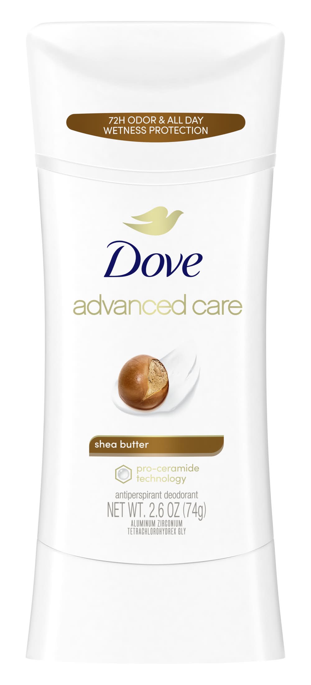 Dove Advanced Care Antiperspirant Deodorant Stick Shea Butter, 2.6 oz • Unilever, Trumbull, CT, 06611 • Packaging: Reusable