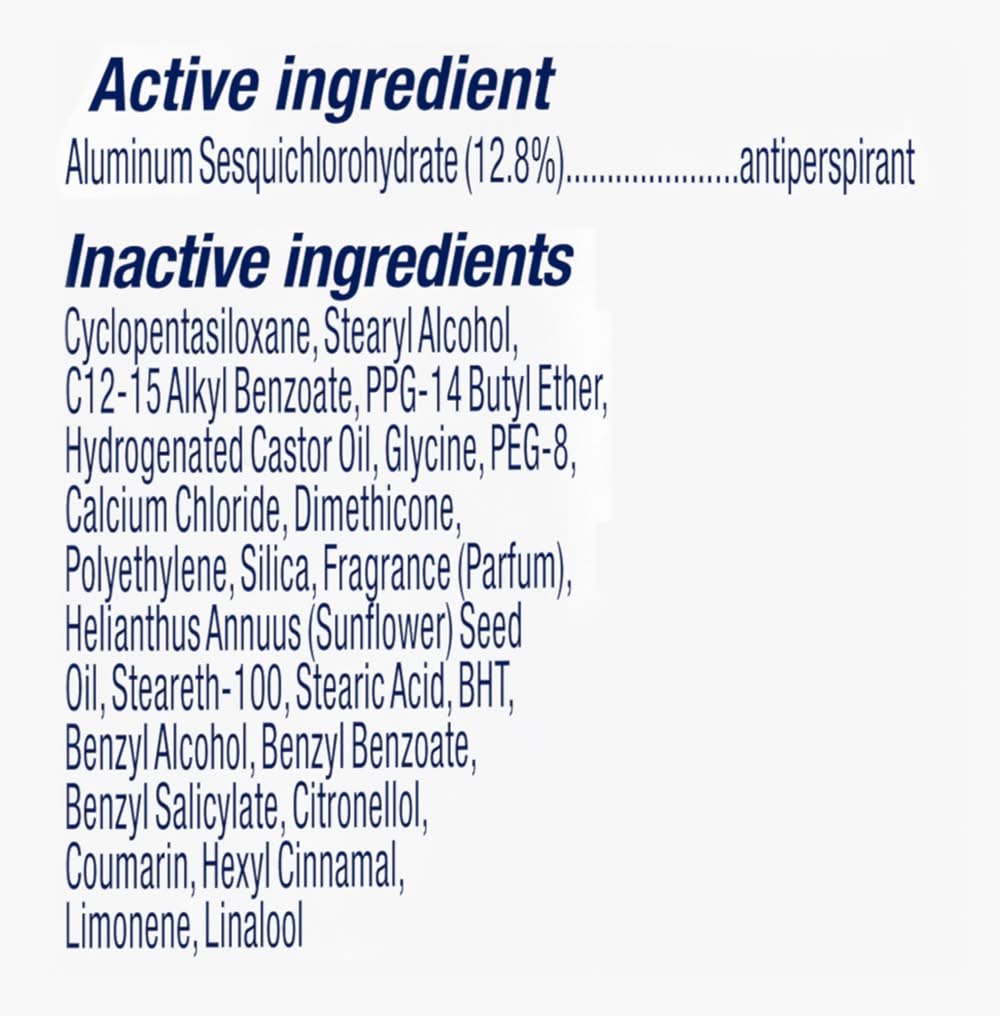 Ingredients: Inactive ingredients Stearyl Alcohol, C12-15 Alkyl Benzoate, Cyclopentasiloxane, Isopropyl Palmitate, PPG-14 Butyl Ether, Hydrogenated Castor Oil, PEG-8, Dimethicone, Helianthus Annuus (Sunflower) Seed Oil, Fragrance (Parfum), Polyethylene, Silica, Steareth-100, BHT, Benzyl Alcohol, Benzyl Benzoate, Benzyl Salicylate, Citronellol, Coumarin, Hexyl Cinnamal, Limonene, Linalool Additives: Stearyl Alcohol, C12-15 Alkyl Benzoate, Cyclopentasiloxane, Isopropyl Palmitate, PPG-14 Butyl Ether, Hydrogenated Castor Oil, PEG-8, Dimethicone, Fragrance (Parfum), Silica, Polyethylene, Helianthus Annuus (Sunflower) Seed Oil, Steareth-100, BHT, Butyrospermum Parkii (Shea)