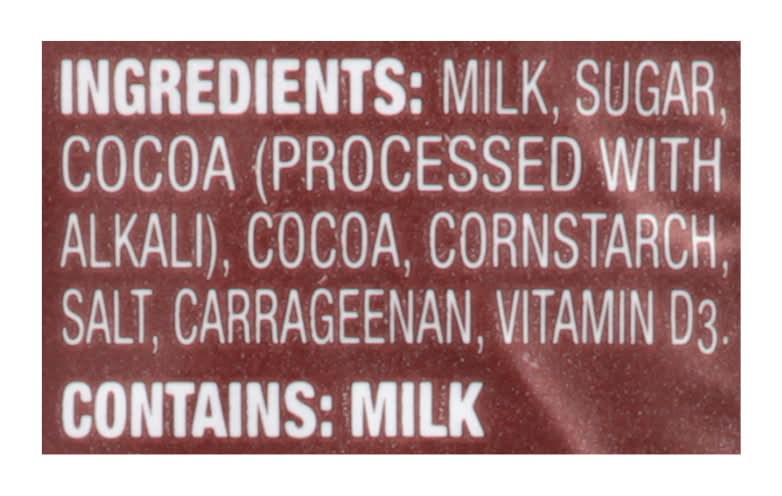 Ingredients: Milk, Sugar, Cocoa (Processed with Alkali), Cocoa, Cornstarch, Salt, Carrageenan, Vitamin D3 Contains: Milk