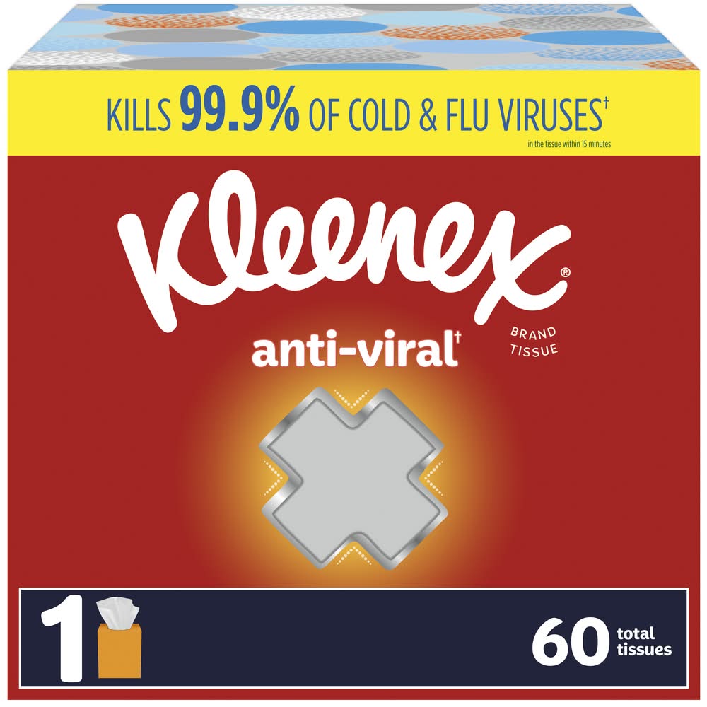 Kleenex Anti-Viral Facial Tissues, 1 Cube Box, 60 Total Tissues • Size: 20.8 x 20.8 cm • Kimberly Clark Global Sales Llc, Dept. KAV60 PO Box 2020 Neenah WI 54957 2020