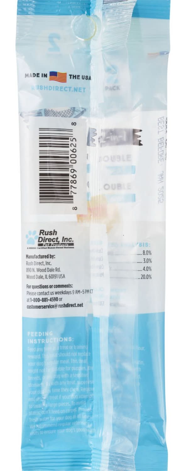 Tail wagging treats Wagging, Long Lasting Chew! Control plaque and tartar through chewing action! GUARANTEED ANALYSIS: Crude Protein (min ) .. 8.0°/ Crude Fat (min.)... ... 3.0% Crude Fiber (max.) ... 4.0% Mcisture (max.)... .. 20.0% CALORIE CONTENT (ME/Calcu:ated): 3150 kcal/kg, 252 kcal/bone Rush Direct, Inc. Pet Products A WBENCE certified Women-Owned Business Manufactured for and distributed exclusively by Rush Direct, Inc. 890 N Wood Dale Rd., For questions or comments please call us weeks days, 9:00 am - 5:00 pm CT at 1.800.881.4590 Visit our website at: www.rushdirect.net Email us at: customerservice@rushdirect.net MADE IN THE U.S.A.