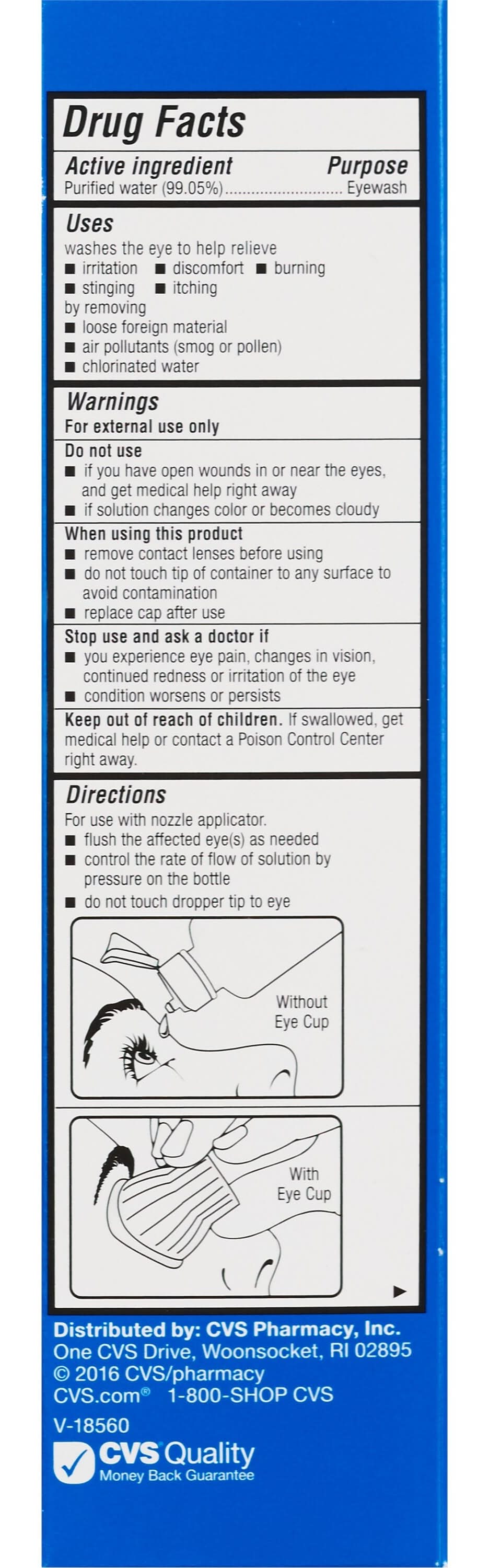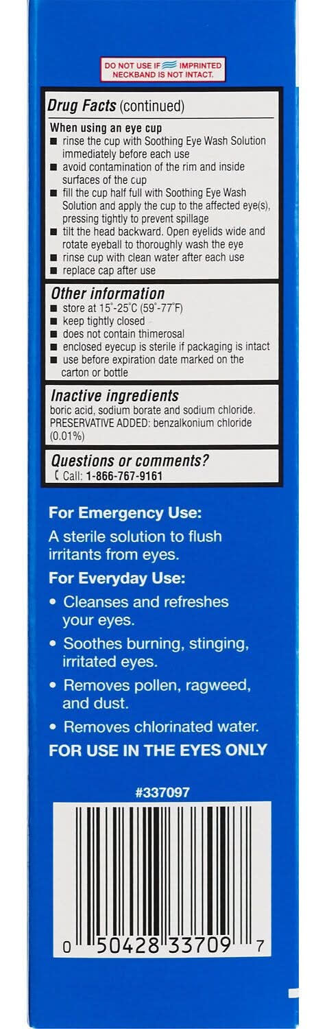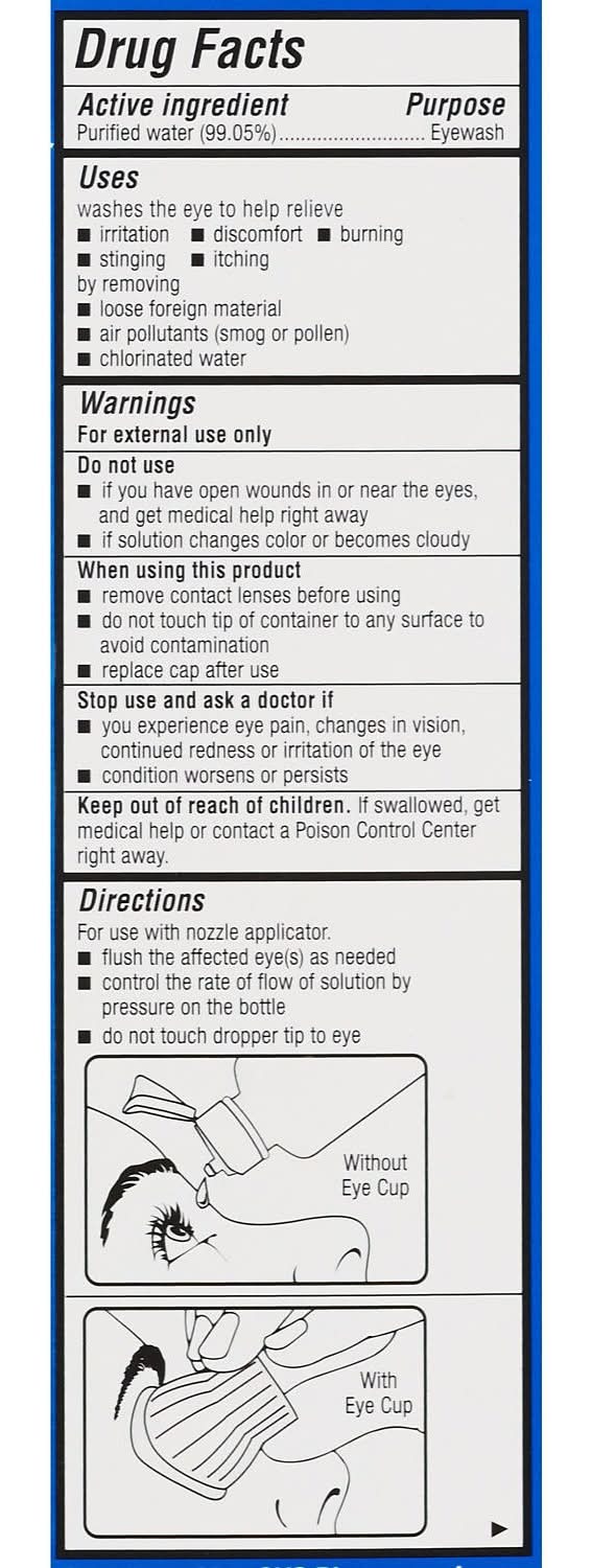 Eye irrigating solution. For daily or emergency eye cleansing. Cleanses. Refreshes. Soothes. Sterile eye cup included. Sterile. For Emergency Use: A sterile solution to flush irritants from eyes. For Everyday Use: Cleanses and refreshes your eyes. Soothes burning, stinging, irritated eyes. Removes pollen, ragweed, and dust. Removes chlorinated water.