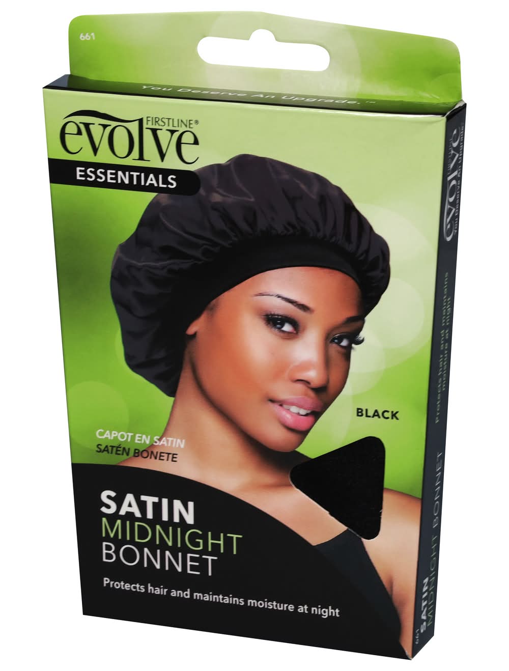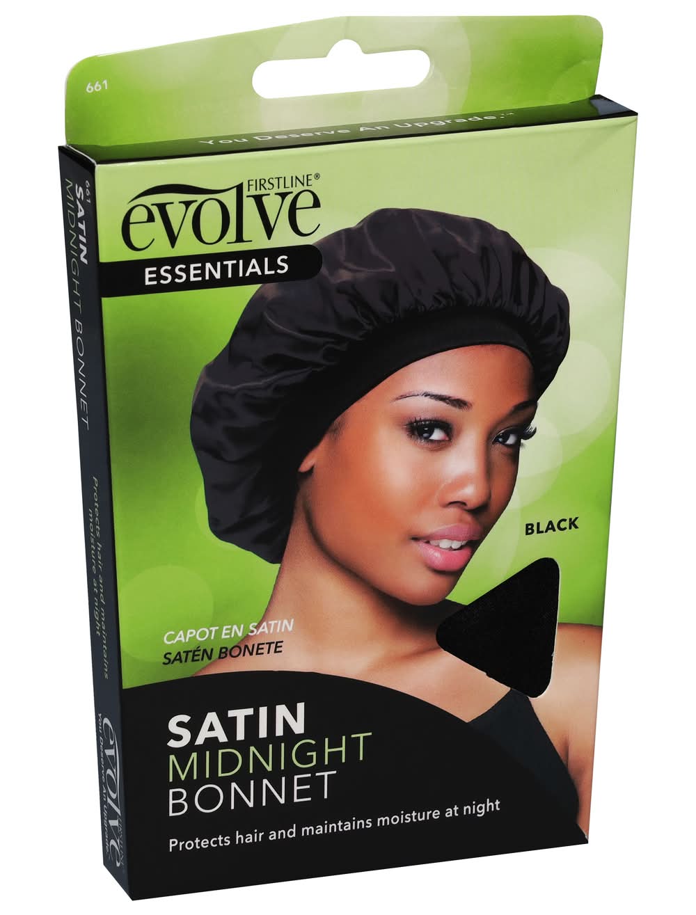 Evolve Satin Bonnet is the must-have haircare essential to retain moisture, reduce frizz and preserve your hairstyle while you sleep. Designed to keep your hair looking fabulous while you sleep, this satin bonnet is a must-have addition to your nighttime routine. Crafted with high-quality satin material, it provides a soft and gentle touch to your hair, preventing frizz, breakage, and tangles. Designed with luxurious satin Perfect for all hair textures and lengths One size fits most Black-Owned or Founded Brand Color: Black