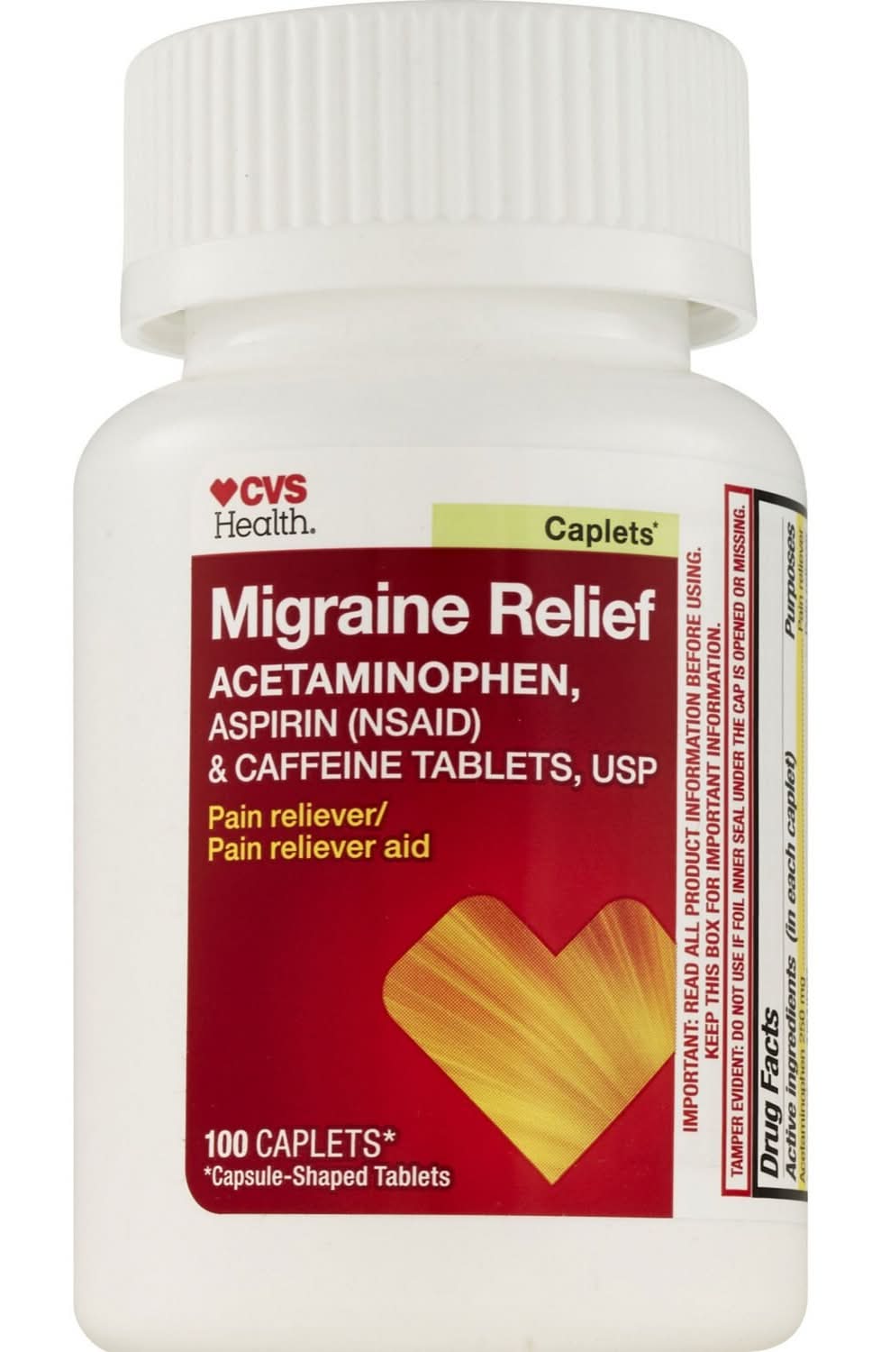 CVS™ Migraine Relief is a pain reliever aid used to treat migraines. At CVS, we believe healthier happens together. That's why we're committed to caring for your well-being, bringing you trusted CVS products that support a healthier, happier life. Join us on the journey to better health, one product at a time. Acetaminophen 250 mg Aspirin 250 mg Caffeine 65 mg 100 caplets Pain reliever and pain reliever aid Compare to Excedrinl® Migraine active ingredient See Drug Facts Label for complete directions and other important information prior to use Please see drug facts panel disclaimer New Heart, New Look: We’ve redesigned our packaging with you in mind. Packaging may vary during this time 100% money-back guarantee on Our CVS Brands. If you are not 100% satisfied with a CVS Pharmacy private brand product, you can return it for free (some exclusions apply*). For more details regarding Our CVS Brands return policy, please visit https://www.cvs.com/retail/help/return_policy.
