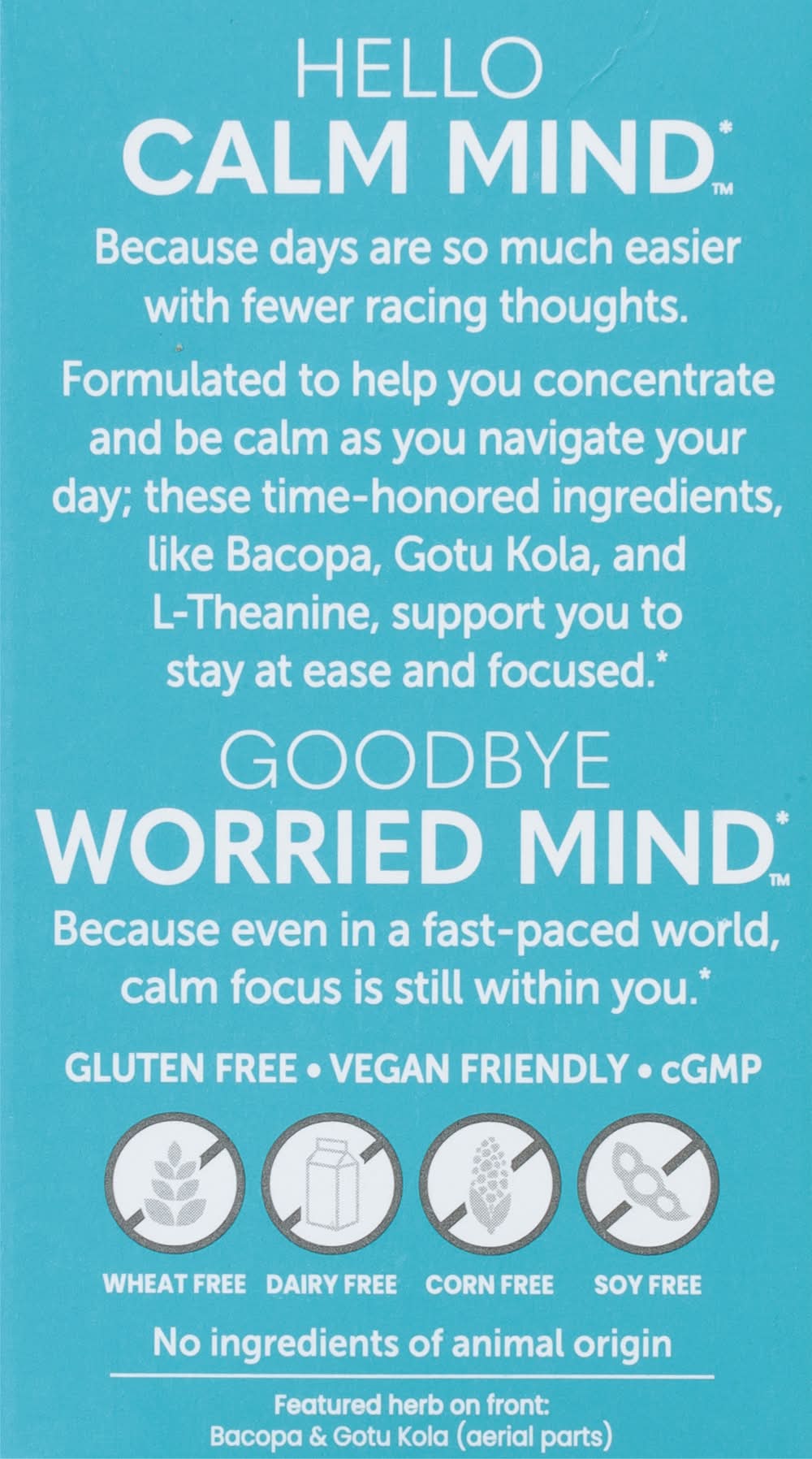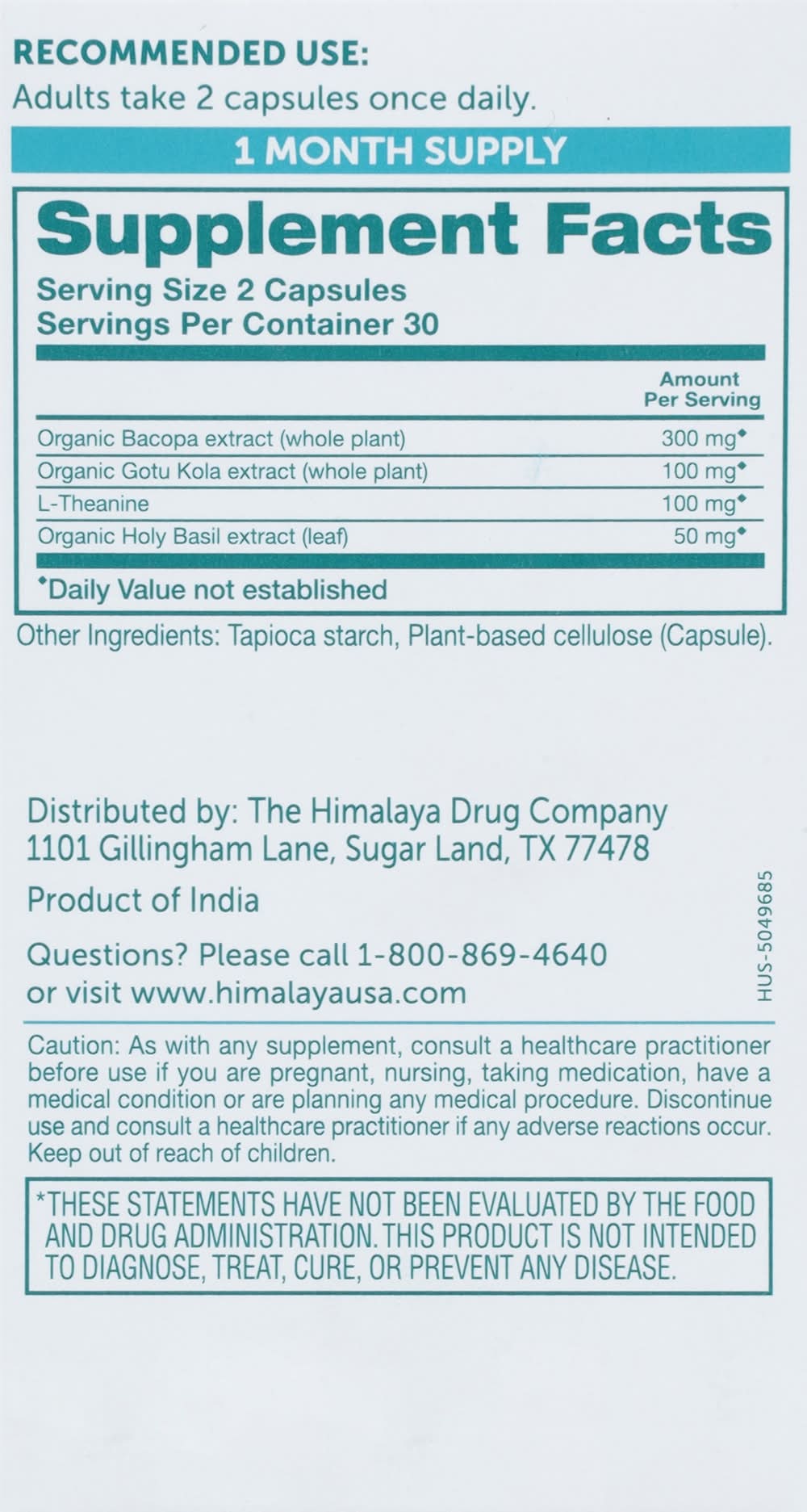 Dietary Supplement. Gluten free. Vegan friendly. Wheat free. Dairy free. Soy free. Corn free. Since 1930. Relaxation, focus & concentration. Includes bacopa, gotu kola & L-theanine. Because days are so much easier with fewer racing thoughts. Formulated to help you concentrate and be calm as you navigate your day; these time-honored ingredients, like Bacopa, Gotu Kola, and L-Theanine, support you to stay at ease and focused. Goodbye worried mind. Because even in a fast-paced world, calm focus is still within you. No ingredients of animal origin. Featured herb on front: Bacopa & Gotu Kola (aerial parts). Happiness through wellness. Crafting traditional medicines based on Ayurveda, a 5,000 year old science that believes the journey back to wholeness begins with nurturing the capacity for joy. Trusting the gifts of nature and the irreplaceable relationship between the plant and its native soil for consistent healing properties. Contributing to the wellness of the earth by teaching our family of farmers to grow native plants sustainably on their land and reduce the demand on the local environment. Building communities by advocating women in farming, protecting fair prices, providing maternal health, sponsoring clinical services and offering school wellness programs. Believing that if wellness is the path to happiness, we must contribute to the wellness of all things. Wellness of people, wellness of the environment, wellness of our communities. Family owned for over 90 years. 1 month supply. www.himalayausa.com. Questions? Please call 1-800-869-4640 or visit www.himalayausa.com. Our glass bottles contain at least 48% recycled content. (These statements have not been evaluated by the food and drug administration. This product is not intended to diagnose, treat, cure, or prevent any disease.) Product of India. Packaging: Reusable