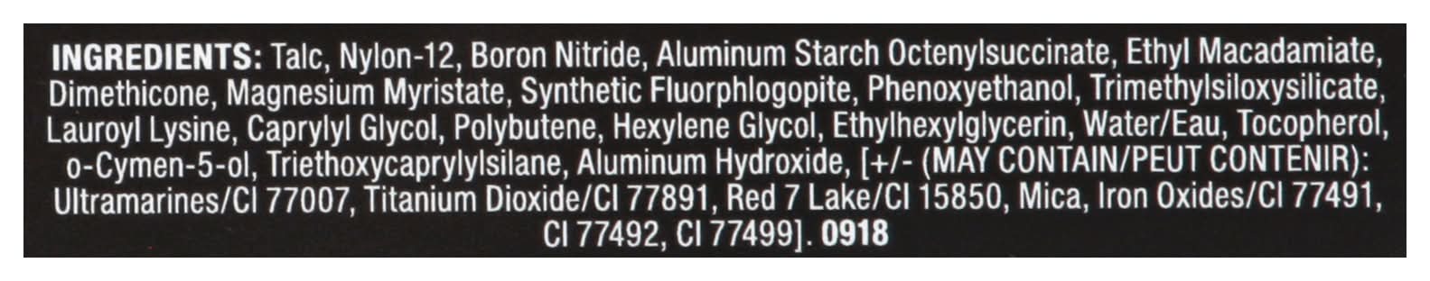 Ingredients: Talc, Nylon-12, Boron Nitride, Aluminum Starch Octenylsuccinate, Ethyl Macadamiate, Dimethicone, Magnesium Myristate, Synthetic, FLuorphogopite, Phenoxyethanol, Trimethylsiloxysilicate, Lauroyl Lysine, Capriylyl Glycol, Polybutene, Hexylene Hlycol, Ethylhexylglycerin, Water/Eau, Tocopherol, o-Cymen-5-ol, Triethoxycaprylylsilane, Aluminum Hydroxide, May Contain: Ultamarines/CL 77007. Titanium Dioxide/CL 77801, Red 7 Lake/Cl 15850, Mica, Iron Oxides/ Cl 77491, Cl 77492, Cl 77499]. 0918
