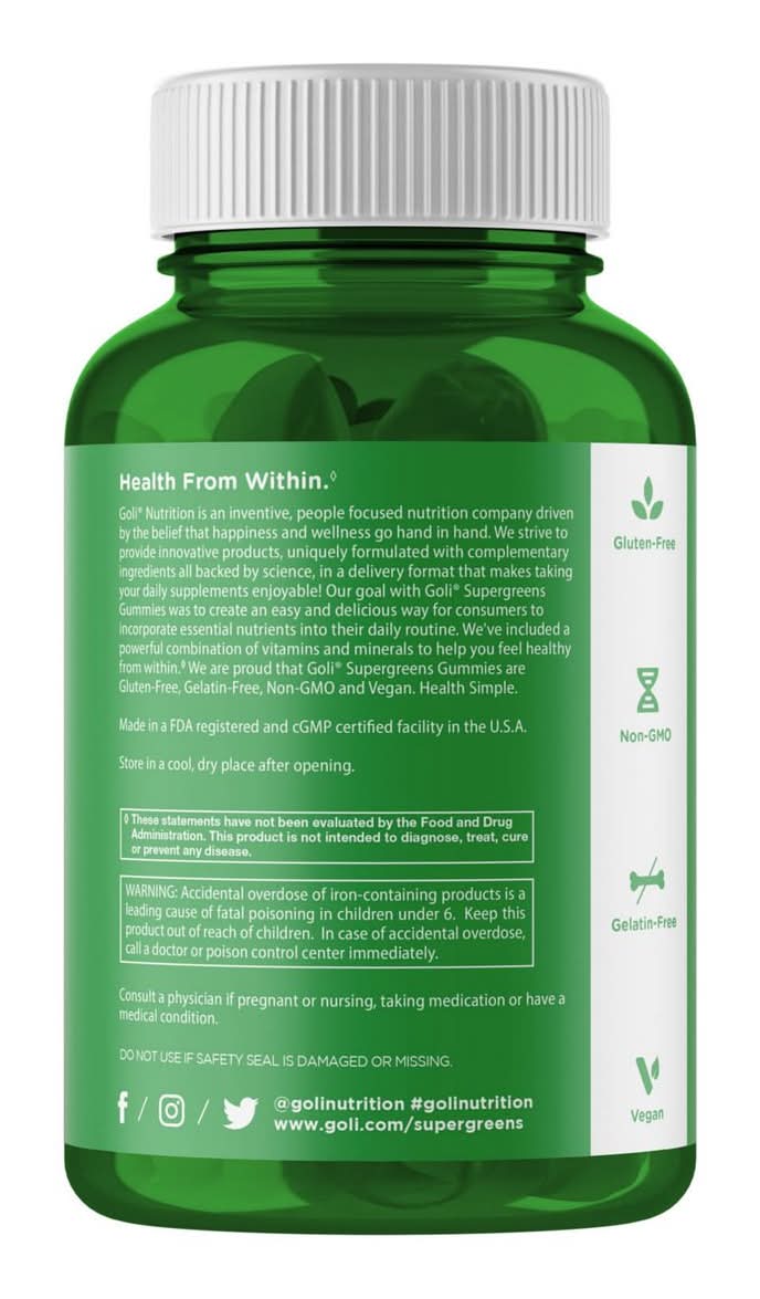 Each Bottle Of Goli Supergreens Gummies Contains 60 Delicious Non-GMO, Vegan, Gluten-free, Gelatin-free Gummies. Health From Within Goli Supergreens. Goli Supergreen Gummies Are Uniquely Crafted With A Super-greens And Probiotic Blend And Added Essential Vitamins And Minerals To Help You Stay On Top Of Your Wellness Goals. Key Ingredients Help Support Digestive Health, Healthy Liver Function, Healthy Immune Function, A Healthy Nervous System.