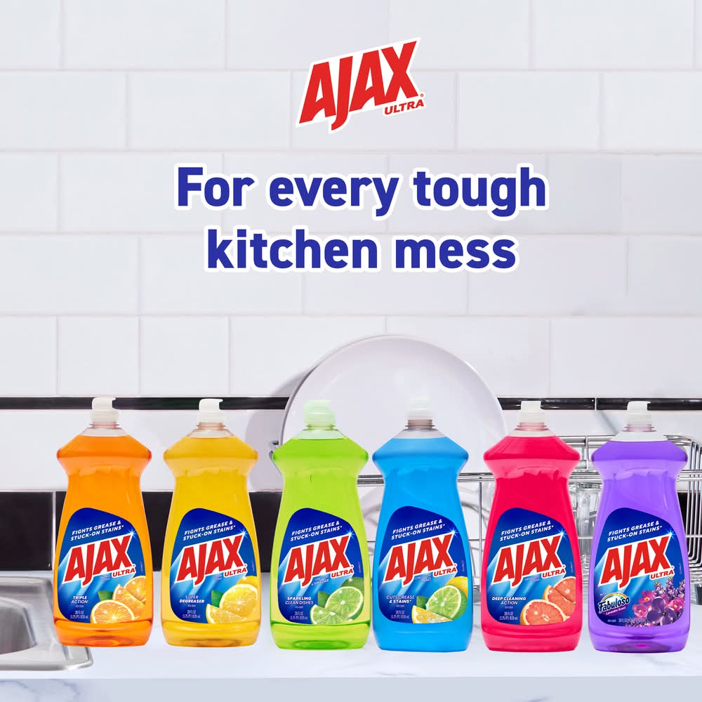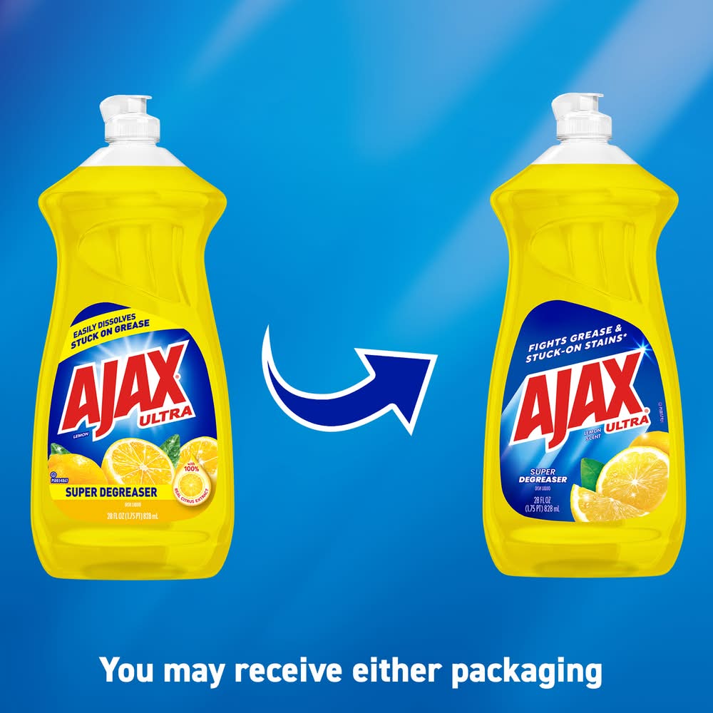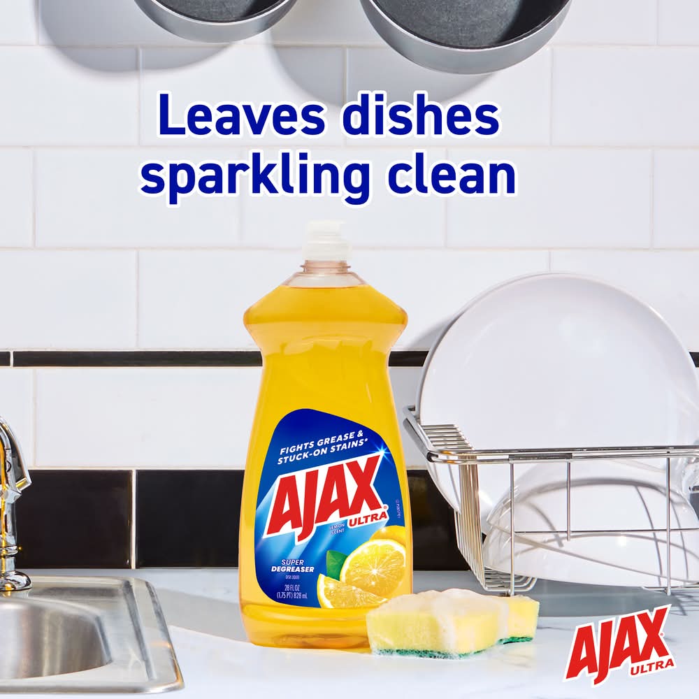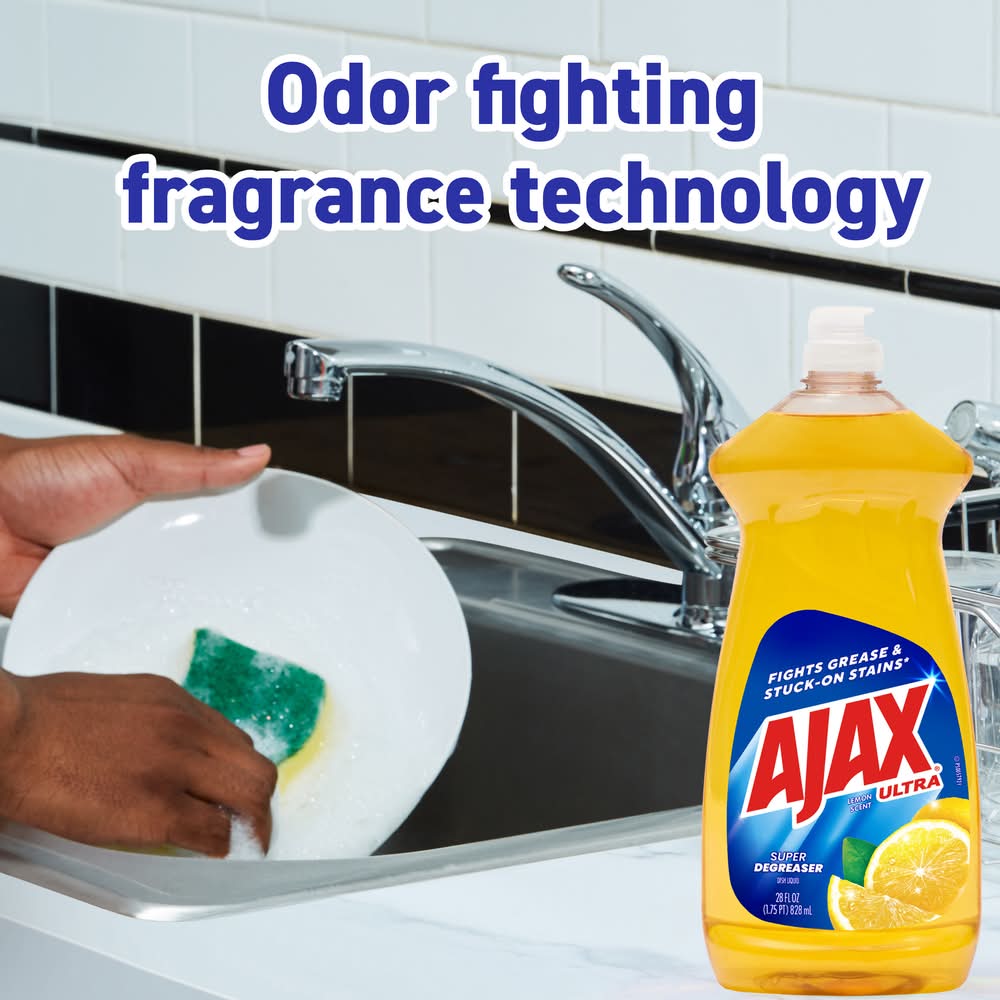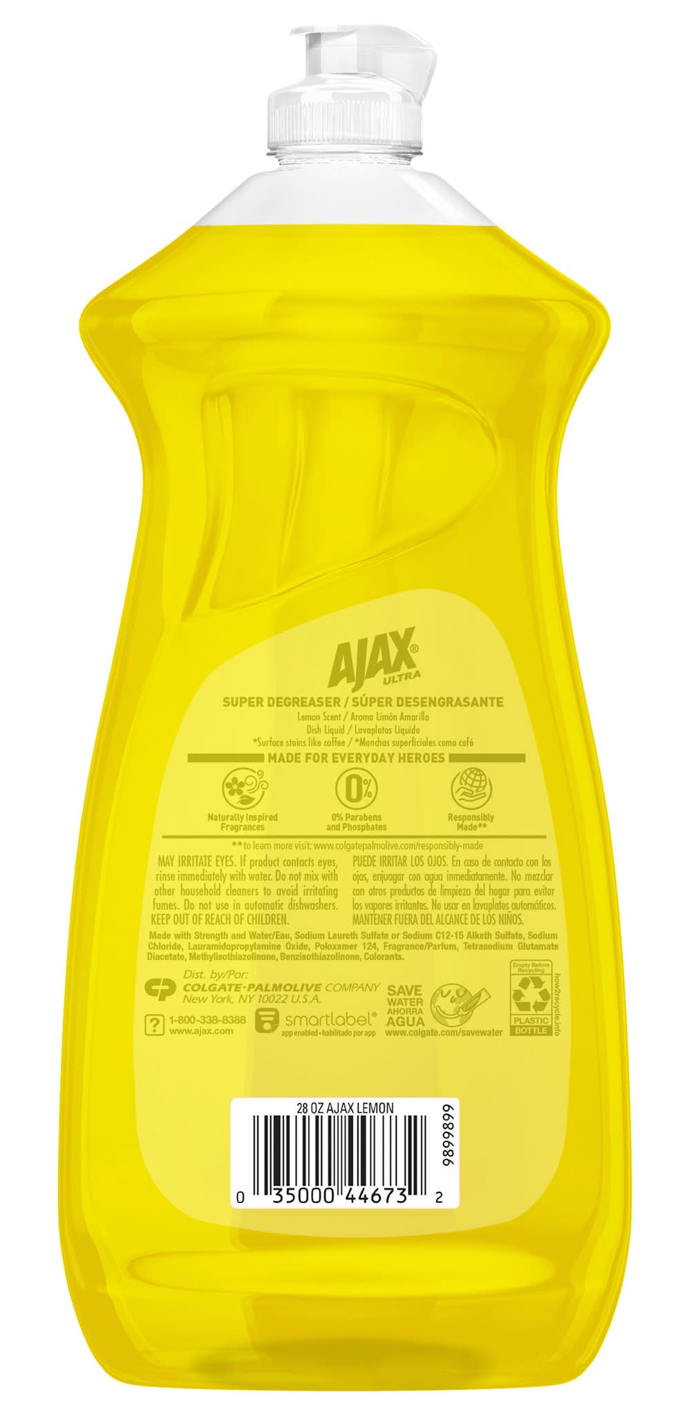 Easily dissolve stuck-on grease Boost your mood and your dishwashing experience: Delight in the fresh, clean aroma of lemon and leave your dishes sparkling clean with Ajax Ultra Super Degreaser Liquid Dish Soap with Lemon Scent. This product easily dissolves stuck-on grease. Enjoy the clean scent of lemon with this dish liquid made from 100% real citrus extract. This product is phosphate-free. Made with naturally inspired fragrances, 0% parabens and phosphates, and 100% biodegradable active ingredients, this dish soap is designed for everyday heroes like you. Plus, try this product to tackle tough jobs beyond dishwashing! Learn more at ajax.com. Life is tough, but you're tougher! We understand that life isn’t easy. You work hard heck, REALLY hard. You tackle big and small tough jobs, without looking for applause. That’s why we at recognize you, the everyday heroes, who step up at the end of a long day and get the dishes done. Because, let’s face it, at the end of the day a clean home is a happy home. By standing tall in the face of messes, you are an everyday hero. Leave the grime to us so you can get back to what really matters! • Colgate-Palmolive Company, New York,NY,10022 • Packaging: Reusable