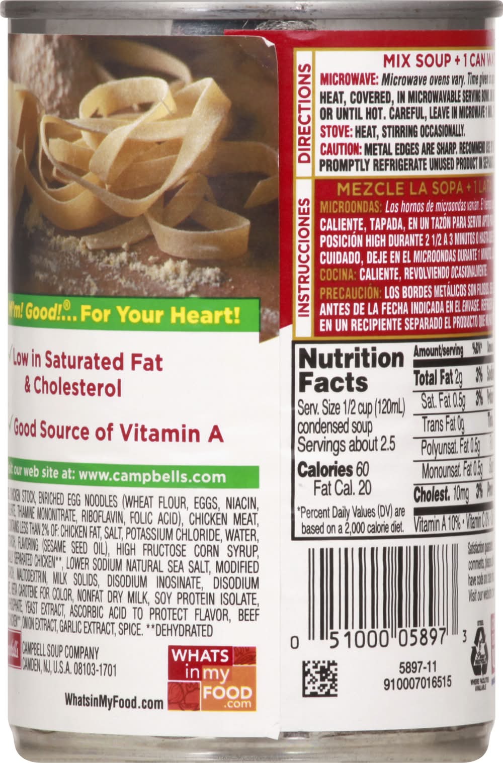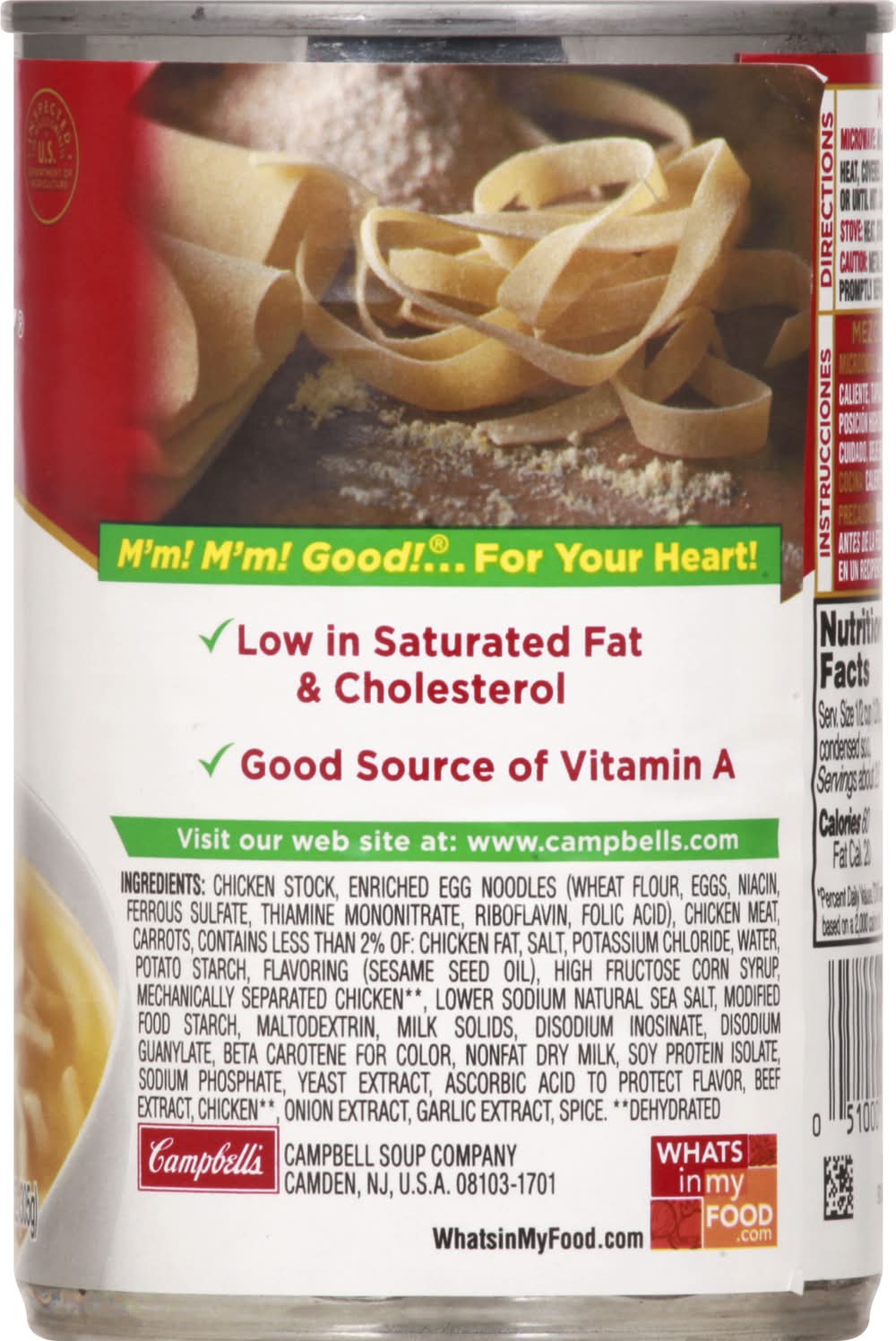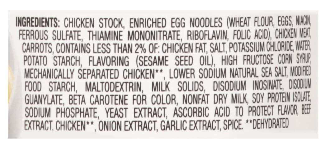 Ingredients: Chicken Stock, Enriched Egg Noodles (Wheat Flour, Eggs, Niacin, Ferrous Sulfate, Thiamine Mononitrate, Riboflavin, Folic Acid), Chicken Meat Carrots, Contains Less than 2% of Chicken Fat, Salt, Potassium Chloride, Water Potato Starch, Flavoring (Sesame Seed Oil), High Fructose Corn Syrup Mechanically Separated Chicken (Dehydrated), Lower Sodium Natural Sea Salt, Modified Food Starch, Maltodextrin, Milk Solids, Disodium Inosinate, Disodium Guanylate, Beta Carotene for Color, Nonfat Dry Milk, Soy Protein Isolate, Sodium Phosphate, Yeast Extract, Ascorbic Acid to Protect Flavor, Beef Extract, Chicken (Dehydrated), Onion Extract, Garlic Extract, Spice