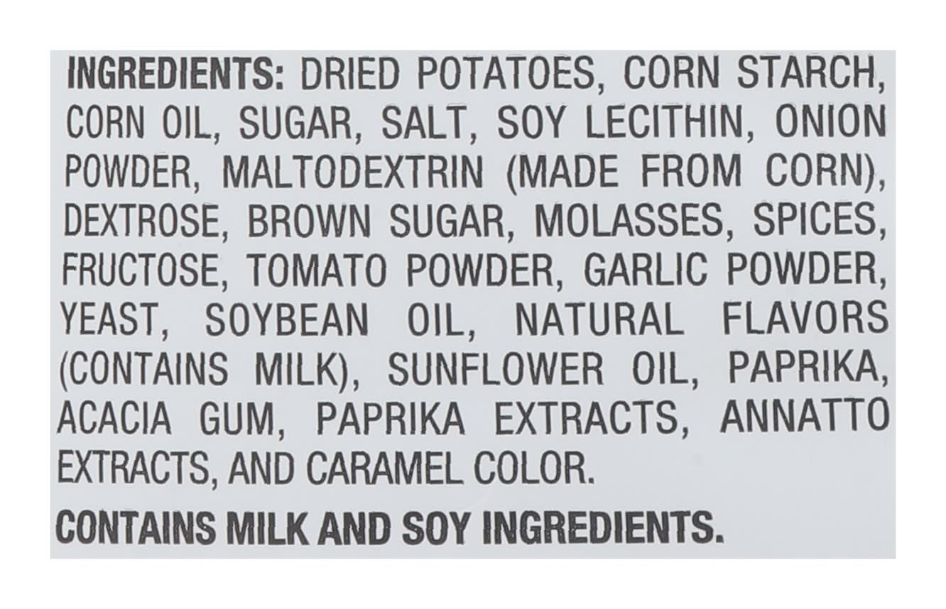 Ingredients: Dried Potatoes, Corn Starch, Corn Oil, Sugar, Salt, Soy Lecithin, Onion Powder, Maltodextrin (made from Corn), Dextrose, Brown Sugar, Molasses, Spices, Fructose, Tomato Powder, Garlic Powder, Yeast, Soybean Oil, Natural Flavors (contains Milk), Sunflower Oil, Paprika, Acacia Gum, Paprika Extracts, Annatto Extracts, Caramel Color Contains: Corn, Soybeans, Milk