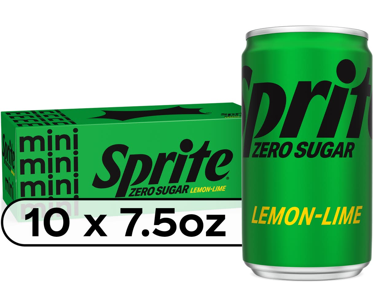 Designers, artists, musicians, athletes. Tastemakers, changemakers and trend-setters. They’ve all got something in common—a thirst. For cutting through the noise with a perspective all their own. And Sprite Zero Sugar helps them quench that thirst.It’s a one-of-a-kind, zero sugar citrus soda that’s got a lemon-lime flavor made with cut through refreshment, making sure you’re ready to leave your mark.How? By keeping it real. Just like you do, an iconic flavor, and whatever you can think of next. It’s all you need to pursue your passions—a moment to take a sip, refresh your senses, and get back to pushing the boundaries wherever you go.Sprite has been the clear choice for zero sugar lemon-lime soda lovers since 1961. It’s made with 100% natural flavors and comes in a variety of sizes and flavors, leaving something for everyone.So, pick up a 7.5oz mini can 10 pack of caffeine-free Sprite Zero Sugar soda today and make your mark. Quench your thirst with refreshing Sprite Zero Sugar soda Clear, crisp lemon-lime, zero sugar soda will keep you invigorated and inspired A delicious citrus taste that knows how to keep things cool Caffeine-free, full of 100% natural flavors 7.5 fl oz mini can 10 pack to help you cut through the noise • Flavor: Lemon-lime • Pack size: 10 • The Coca-cola Company, Atlanta, GA, 30313 • Packaging: Reusable
