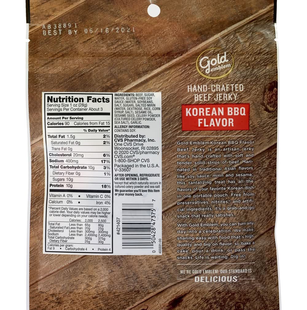 Gold Emblem Korean BBQ Flavor Beef Jerky is an artisan jerky that's hand crafted with soft and tender solid strips of beef. Marinated in traditional Asian flavors like soy sauce, mirin and sesame, this tantalizing treat has all the flavors of your favorite Korean dish in one portable pouch. Free form preservatives, nitrites, and artificial ingredients, it's a grab-and-go snack that really satisfies. With Gold Emblem, you can turn any day into a celebration. We make sharing easy with food that's high quality and big on flavor: so bake a cake, pour a drink, or pass the snacks. Life is waiting. Dig in! We're Gold Emblem: Our standard is delicious. Flavor: Korean bbq