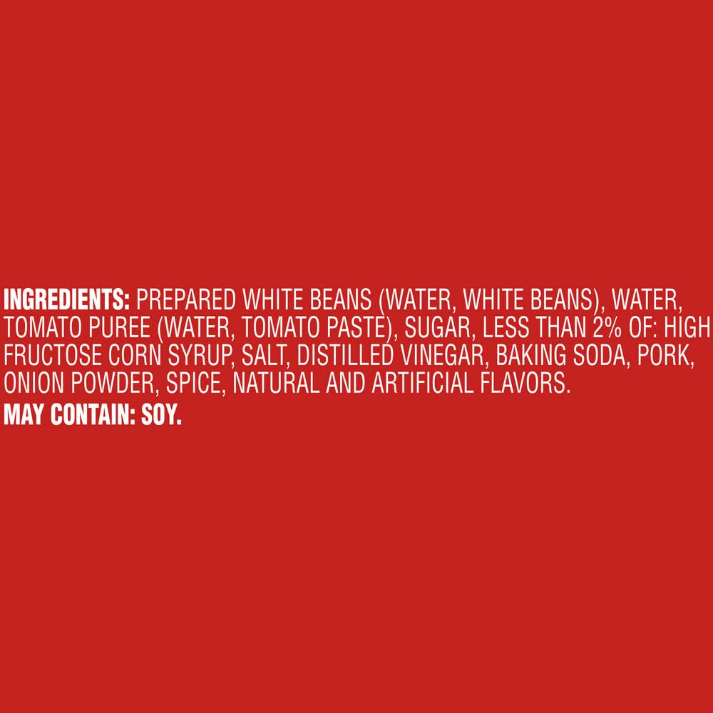 Ingredients: Prepared White Beans (Water, White Beans), Water, Tomato Puree (Water, Tomato Paste), Sugar, Less than 2% of: High Fructose Corn Syrup, Salt, Distilled Vinegar, Pork*, Baking Soda, Onion Powder, Natural and Artificial Flavors, Spice, Calcium Chloride (A Firming Agent), . *Adds a trivial amount of cholesterol. MAY CONTAIN: SOY. Contains: Soy