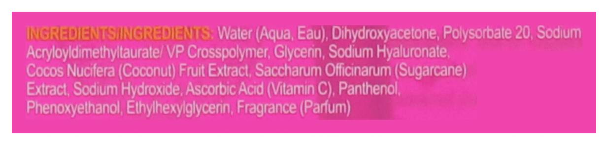 Ingredients: Water (Aqua, Eau), Dihydroxyacetone, Polysorbate 20, Sodium Acryloyldimethyltaurate/VP Crosspolymer, Glycerin, Sodium Hyaluronate Cocos Nucifera (Coconut) Fruit Extract, Saccharum Officinarum (Sugarcane) Extract, Sodium Hydroxide, Ascorbic Acid (Vitamin C), Panthenol, Phenoxyethanol, Ethylhexylglycerin, Fragrance (Parfum)