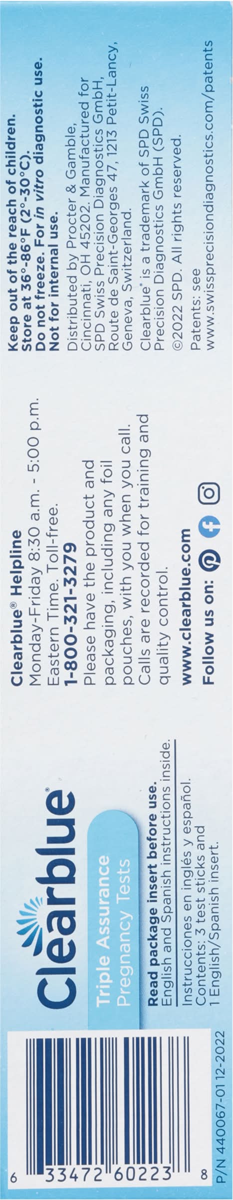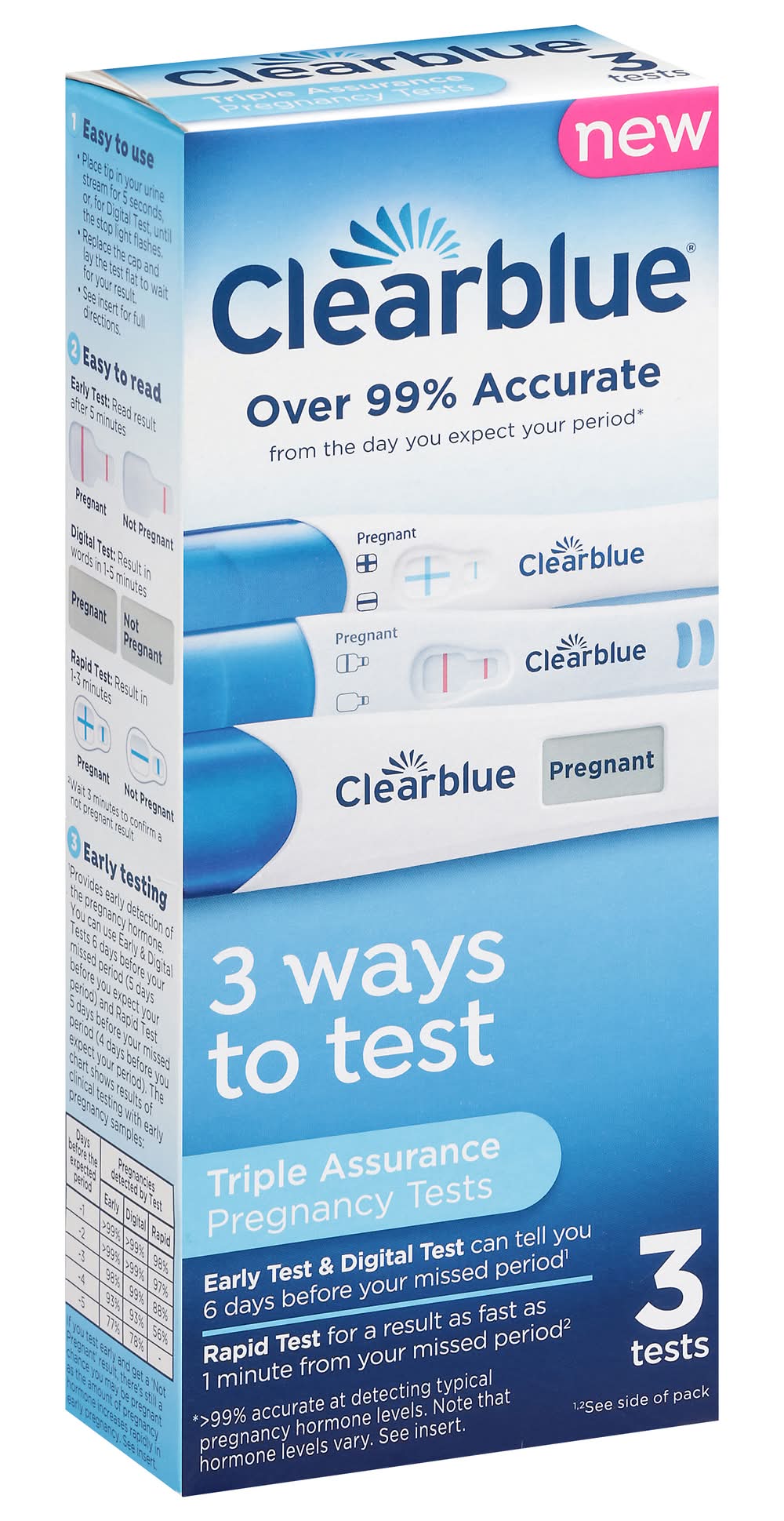 When taking a pregnancy test, you want fast, accurate and easy to read results. This pregnancy test kit includes 3 individually wrapped tests that are over 99% accurate from the day you expect your period[1]. Each test has an extra-wide tip for easy sampling and includes unique Floodguard(TM) Technology that makes it easy to test correctly. All home pregnancy tests detect the “pregnancy hormone” (hCG), which starts showing up in your urine shortly after implantation. If you want to test early, the Clearblue® Early Detection Pregnancy Test [Clearblue Detección Temprana Prueba de Embarazo] can be used from 6 days before your missed period (5 days before you expect your period)[2]. Its DualSense(TM) Technology may help prevent false positive results in a very small number of non-pregnant women who may have low levels of hCG in their urine.The Clearblue® Early Digital Pregnancy Test [Clearblue Prueba de Embarazo Digital Temprana] can also be used 6 days early (2}. It has a unique stop light that flashes red to tell you when you have sampled enough urine and provides clear, digital results in words (“Pregnant” or “Not Pregnant”). When you need an answer quickly, the Clearblue® Rapid Detection Pregnancy Test [Clearblue Prueba de Embarazo de Detección Rápida] provides a result as fast as 1 minute[3] with clear, plus (+) or minus (-) results.Clearblue®: results you can trust.[1] >99% accurate at detecting typical pregnancy hormone levels. Note that hormone levels vary. See insert. [2] Provides early detection of the pregnancy hormone. Early Detection Pregnancy Test: 77% of pregnant results can be detected 6 days before your missed period (5 days before the expected period). Early Digital Pregnancy Test: 78% of pregnant results can be detected 6 days before your missed period (5 days before the expected period). [3] A pregnant result may appear in 1 minute when testing from the day of your missed period. Wait 3 minutes to confirm a not pregnant result. TRIPLE ASSURANCE PREGNANCY TEST KIT: Includes one (1) Early Detection Pregnancy Test, one (1) Early Digital Pregnancy Test, and one (1) Rapid Detection Pregnancy Test OVER 99% ACCURATE: All tests in the Clearblue Triple Assurance Pregnancy Test kit are over 99% accurate from the day you expect your period[1] RESULTS 6 DAYS SOONER: Both Clearblue's Early Detection PregnancyTest & Early Digital Pregnancy Test can tell you 6 days sooner than your missed period (5 days before you expect your period)[2] DUALSENSE(TM) TECHNOLOGY: Clearblue Early Detection Pregnancy Test is the first Clearblue test with DualSense Technology, which may help prevent false positives in the very small number of nonpregnant women who may have low levels of hCG in their urine CLEAR, DIGITAL RESULTS: Clearblue Early Digital Pregnancy Test gives you clear, digital “Pregnant” or “Not Pregnant” results in words