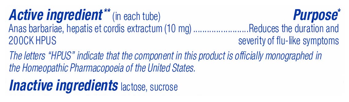 Ingredients: Anas Barbariae Hepatis et Cordis Extractum (200 CK) HPUS, Lactose, Sucrose Contains: Allergens Additives: Lactose, Sucrose