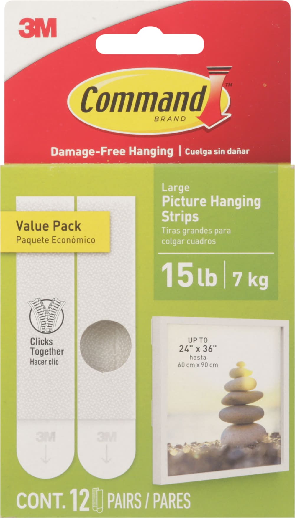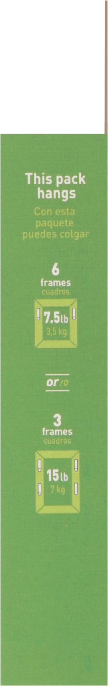 Damage-free hanging. Up to 24 inches x 36 inches. Holds strongly. Removes cleanly. This pack hangs: 6 Frames: 7.5 lb (3.5 kg) or 3 Frames: 15 lb (7 kg). Limited warranty limitation of liability (USA): Product will be free from manufacturing defects. If defective, 3M will replace or refund at 3M's option. 3M will not be liable for any loss or damage, whether direct, indirect, incidental or consequential. Made in USA with globally sourced materials. • Color: White • Size: L • 3M, ST. Paul, MN, 55144-1000, Ph: 800-934-7355