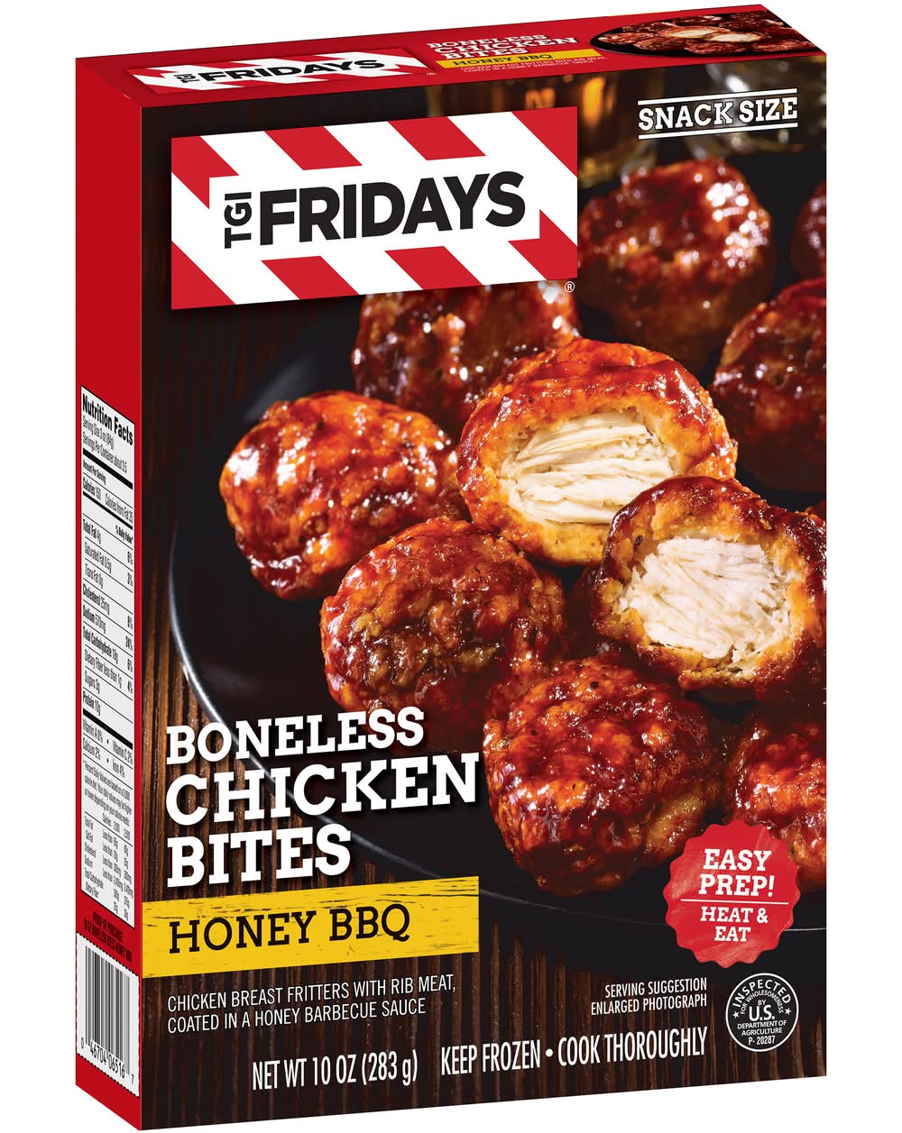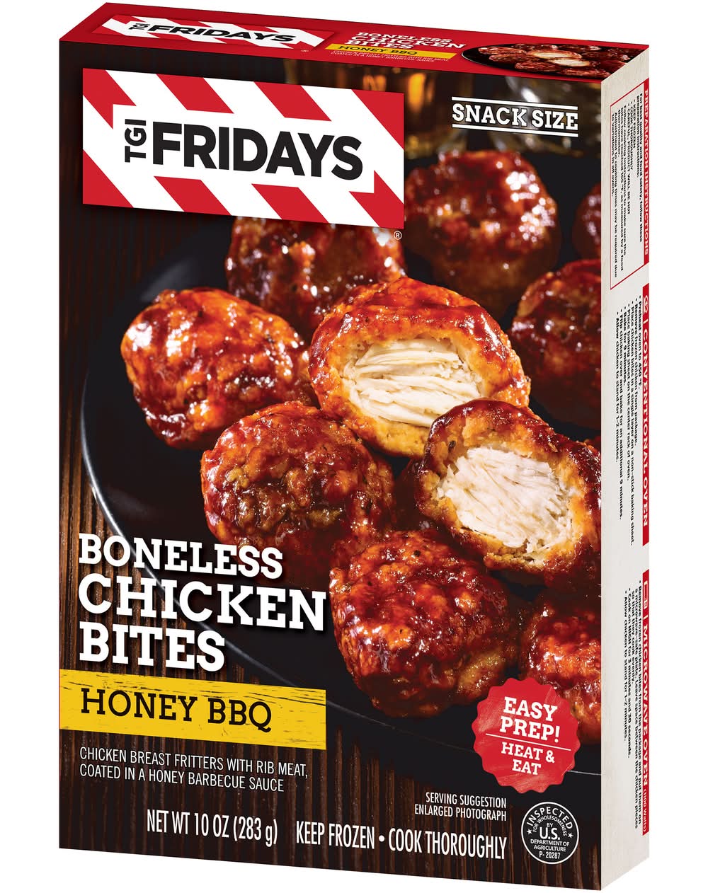 Enjoy your TGI Fridays menu favorites at home with our easy restaurant style appetizers. Ready to heat, TGI Fridays Honey BBQ Boneless Chicken Bites are a quick and delicious appetizer or party food. Our TGIF breaded chicken breast bites are coated in a honey barbecue sauce. Packaged in a box for convenient storage, you can heat our chicken bites in the microwave or conventional oven. Store our box of honey BBQ boneless chicken bites in the freezer until ready to prepare. Whether you’re craving chicken bites and wings, potato skins, spinach artichoke dip, mozzarella sticks, sliders or jalapeno poppers, TGI Fridays has frozen appetizers the whole family will enjoy. Heinz North America, A Division of H.J. Heinz Company, L.P., Pittsburgh,PA,15222