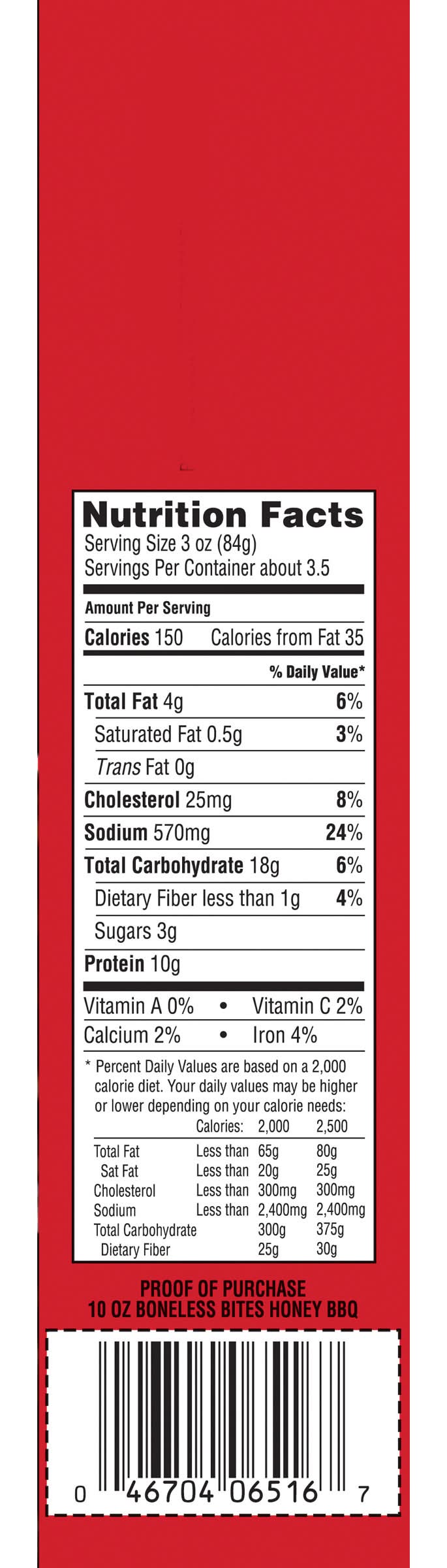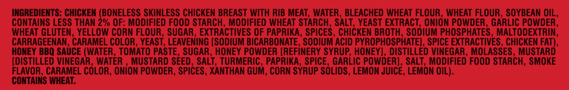 Ingredients: CHICKEN, BONELESS SKINLESS CHICKEN BREAST WITH RIB MEAT, WATER, BLEACHED WHEAT FLOUR, WHEAT FLOUR, SOYBEAN OIL, CONTAINS LESS THAN 2% OF: MODIFIED FOOD STARCH, MODIFIED WHEAT STARCH, SALT, YEAST EXTRACT, ONION POWDER, GARLIC POWDER, WHEAT GLUTEN, YELLOW CORN FLOUR, SUGAR, EXTRACTIVES OF PAPRIKA, SPICES, CHICKEN BROTH, SODIUM PHOSPHATES, MALTODEXTRIN, CARRAGEENAN, CARAMEL COLOR, YEAST, LEAVENING (SODIUM BICARBONATE, SODIUM ACID PYROPHOSPHATE), SPICE EXTRACTIVES, CHICKEN FAT, HONEY BBQ SAUCE (WATER, TOMATO PASTE, SUGAR, HONEY POWDER [REFINERY SYRUP, HONEY], DISTILLED VINEGAR, MOLASSES, MUSTARD [DISTILLED VINEGAR, WATER , MUSTARD SEED, SALT, TURMERIC, PAPRIKA, SPICE, GARLIC POWDER], SALT, MODIFIED FOOD STARCH, SMOKE FLAVOR, CARAMEL COLOR, ONION POWDER, SPICES, XANTHAN GUM, CORN SYRUP SOLIDS, LEMON JUICE, LEMON OIL), . Contains: CONTAINS: WHEAT.