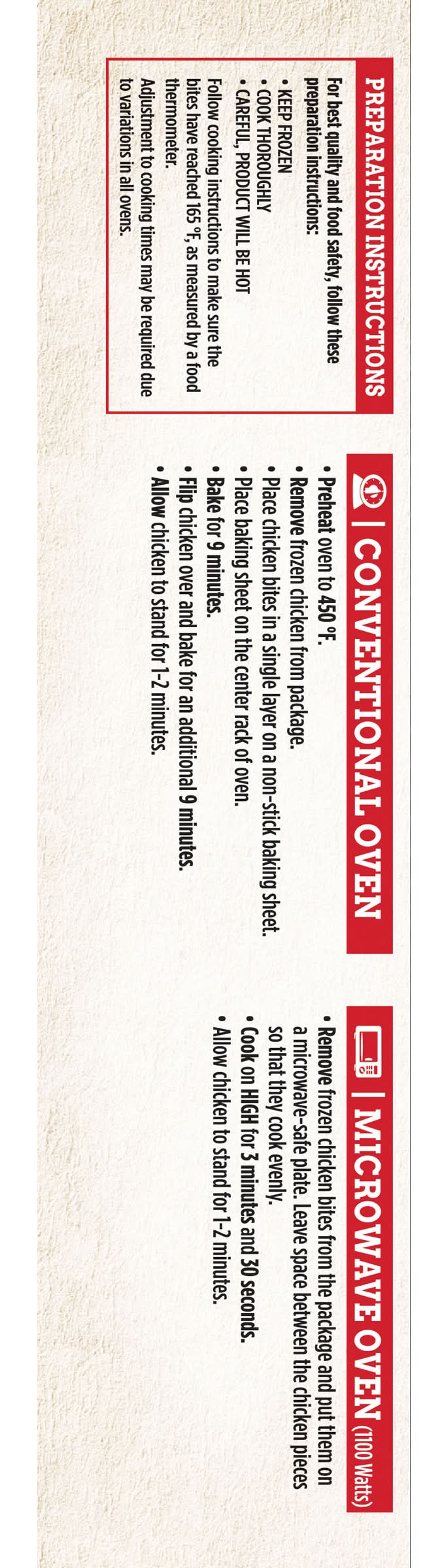 Directions for use: Microwaving: Microwave Oven (1100 Watts): • Remove frozen chicken bites from the package and put them on a microwave-safe plate. Leave space between the chicken pieces so that they cook evenly. • Cook on HIGH for 3 minutes and 30 seconds. • Allow chicken to stand for 1–2 minutes. Baking: Conventional Oven: • Preheat oven to 450ºF. • Remove frozen chicken from package. • Place chicken bites in a single layer on a non-stick baking sheet. • Place baking sheet on the center rack of oven. • Bake for 9 minutes. • Flop chicken over and bake for an additional 9 minutes. • Allow chicken to stand for 1-2 minutes. Keep frozen. Storage recommendation: Keep frozen.