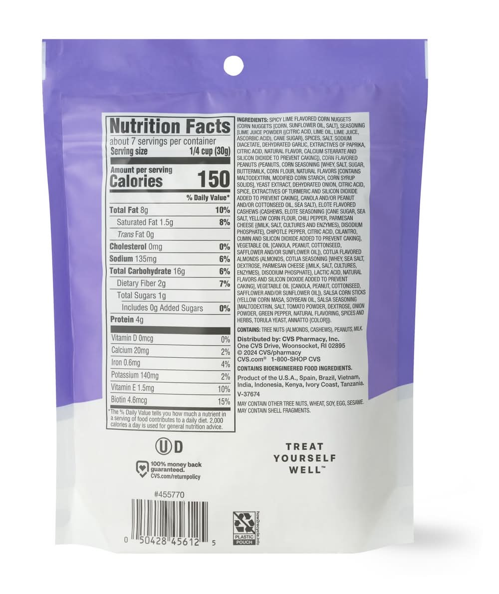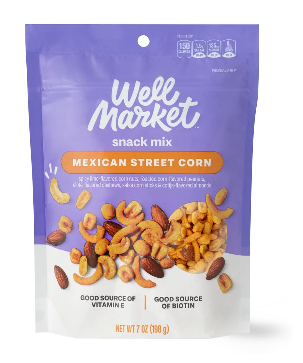 Well Market™ Mexican Street Corn Snack Mix is a savory snack made with a blend of cashews, almonds, peanuts, corn nuggets, and corn sticks. The zesty flavor of elote will take your tastebuds on a trip to Latin America and provide you with a good source of biotin and vitamin E. Eating is personal. We get it! So we've made it our mission to meet your wellness needs with crave-worthy goodness. Taste-tested by food lovers to boost your wellbeing and better your day. High in antioxidant Vitamin E Good source of biotin Savory snack made with a blend of cashews, almonds, peanuts, corn nuggets, and corn sticks