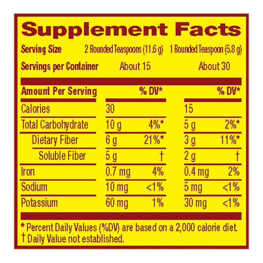 Daily Fiber Supplement. 30 teaspoons (Serving size varies. See directions on back panel for more information). Naturally & artificially flavored. Sugar-Free: Not a low calorie food. No. 1 doctor recommended brand. Make a change. Helps you feel less hungry between meals . Helps maintain healthy blood sugar levels as part of your diet. Helps lower cholesterol to promote heart health (See back for information about soluble fiber and heart disease). Promotes digestive health. 100% natural psyllium husk. Procter & gamble, Cincinnati,OH,45202