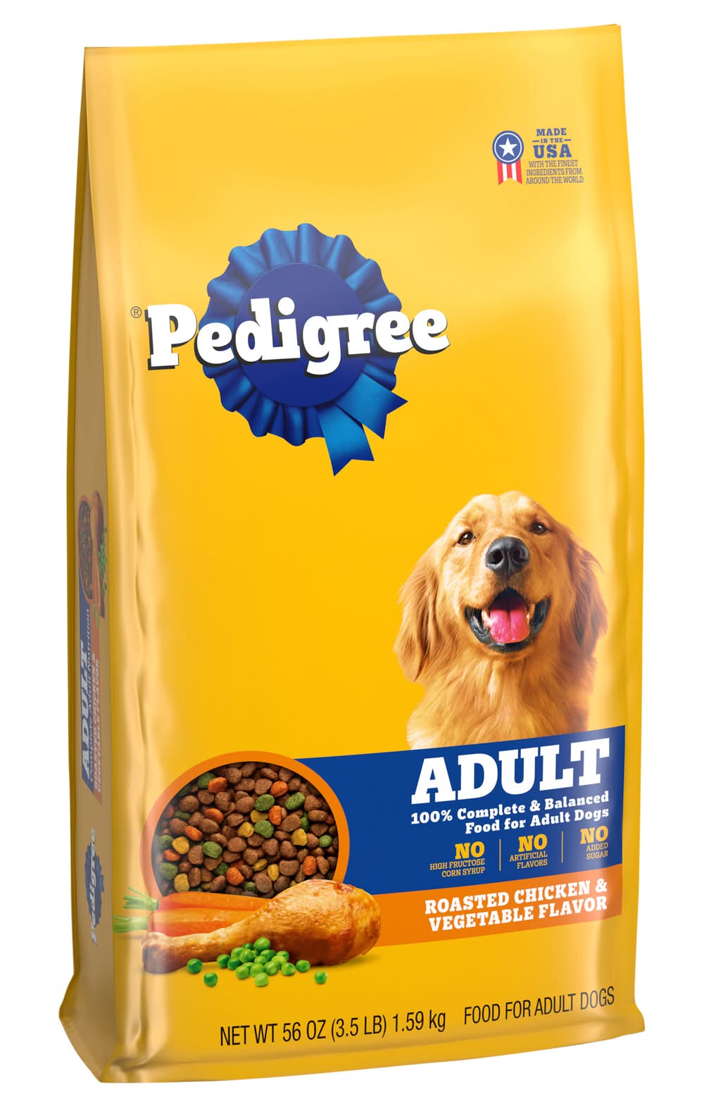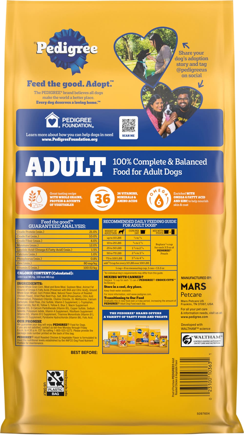 Directions for use: Store in a cool, dry place. Recommended daily feeding guide for adult dogs (An individual dog's requirements may differ from this guide). Weight of Adult Dog: Up to 10 lb; 1/3 to 1 cups per day; Replace 1/4 cup for each 3.5 oz of Pedigree pouch. Weight of Adult Dog: 10 to 25; 1 to 1 3/4 cups per day; Replace 1/4 cup for each 3.5 oz of Pedigree pouch; Weight of Adult Dog: 25 to 50; 1 3/4 to 3 cups per day; Replace 1/4 cup for each 3.5 oz of Pedigree pouch; Weight of Adult Dog: 50 to 75; 3 to 4 cups per day; Replace 1/4 cup for each 3.5 oz of Pedigree pouch; Weight of Adult Dog 75 to 100; 4 to 5 cups per day; replace 1/4 cup for each 3.5 oz of Pedigree pouch; 1 cup = 8 oz measuring cup, 1 can = 13.2 oz. Mixing with canned? Replace 1/2 cup for each 1/2 can of Pedigree Choice Cuts in Gravy. Store in a cool, dry place. Keep fresh water available. For more information, visit www.pedigree.com. Transitioning to our food gradually mix in new food over a 4 day period, increasing the amount of pedigree adult dog food each day. Storage recommendation: Store in a cool, dry place.