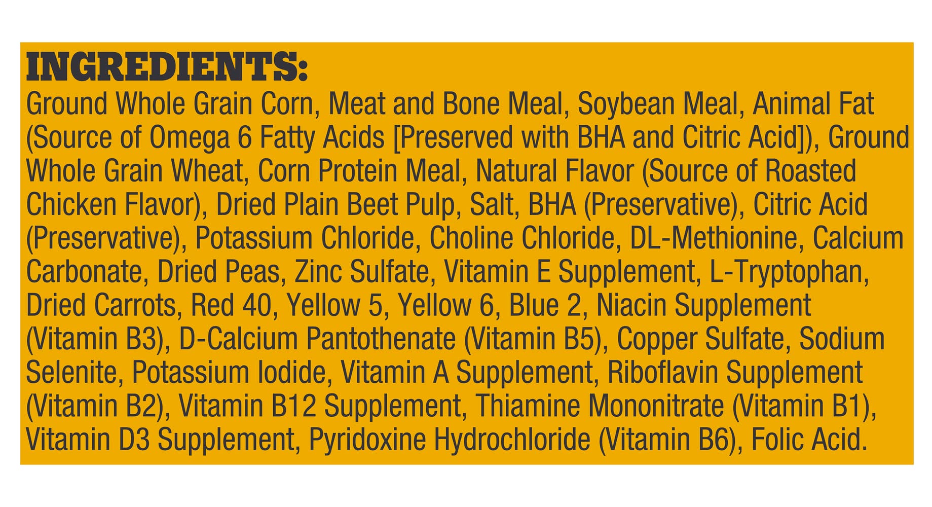 Ingredients: Ground Whole Grain Corn, Meat and Bone Meal, Soybean Meal, Animal Fat (Source of Omega 6 Fatty Acids [Preserved with BHA and Citric Acid]), Ground Whole Grain Wheat, Corn Protein Meal, Natural Flavor (Source of Roasted Chicken Flavor), Dried Plain Beet Pulp, Salt, BHA (Preservative), Citric Acid (Preservative), Potassium Chloride, Choline Chloride, DL-Methionine, Calcium Carbonate, Dried Peas, Zinc Sulfate, Vitamin E Supplement, L-Tryptophan, Dried Carrots, Red 40, Yellow 5, Yellow 6, Blue 2, Niacin Supplement (Vitamin B3), D-Calcium Pantothenate (Vitamin B5), Copper Sulfate, Sodium Selenite, Potassium Iodide, Vitamin A Supplement, Riboflavin Supplement (Vitamin B2), Vitamin B12 Supplement, Thiamine Mononitrate (Vitamin B1), Vitamin D3 Supplement, Pyridoxine Hydrochloride (Vitamin B6), Folic Acid Contains: Soybeans, Wheat