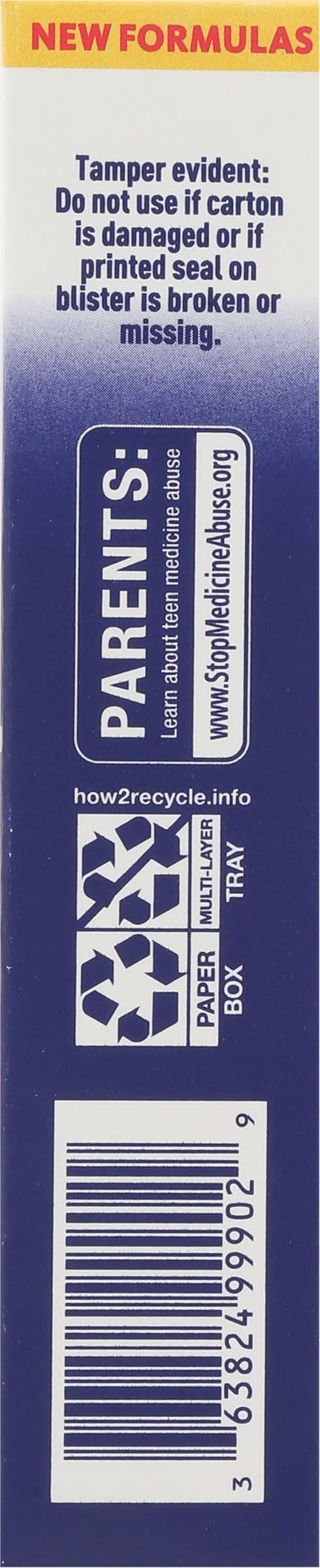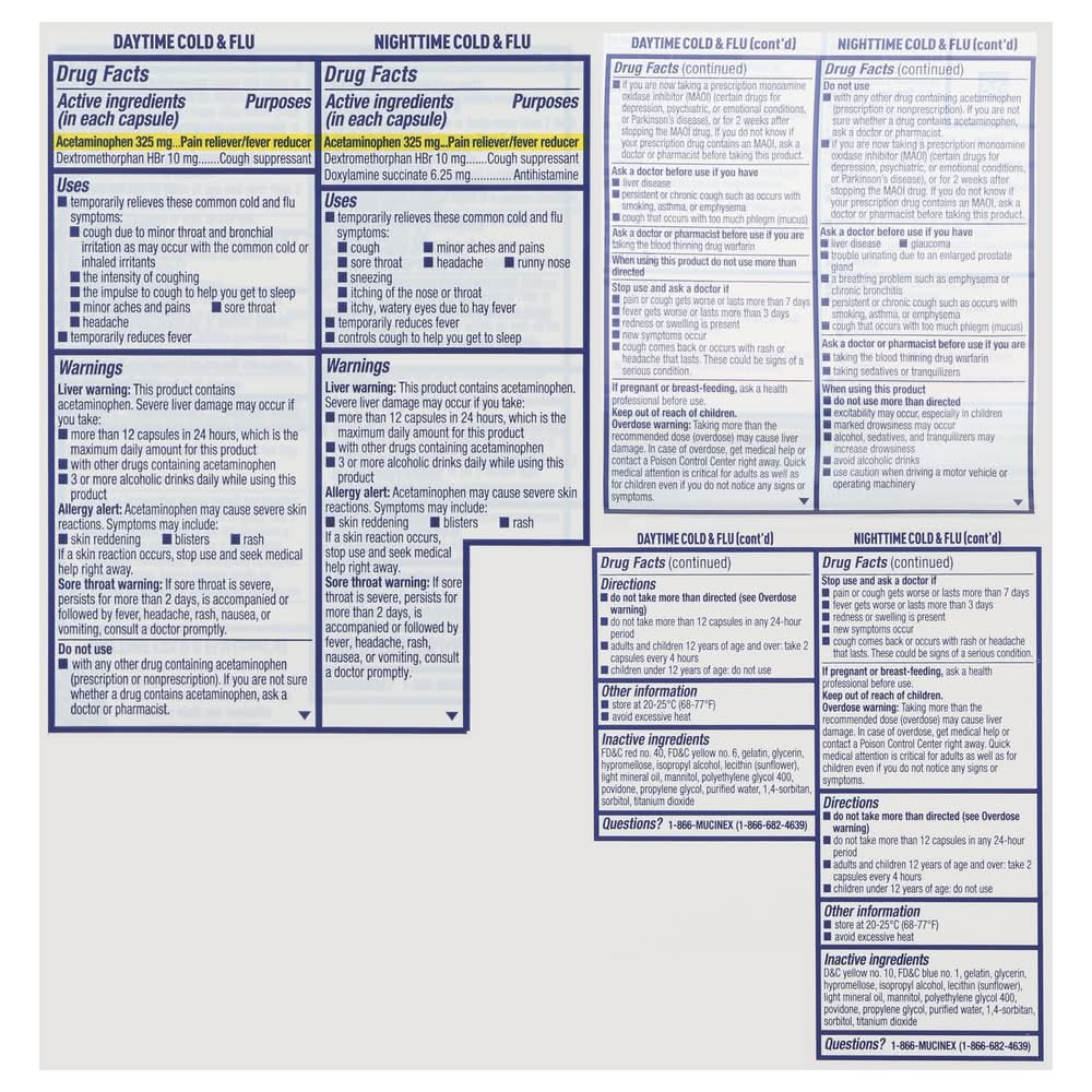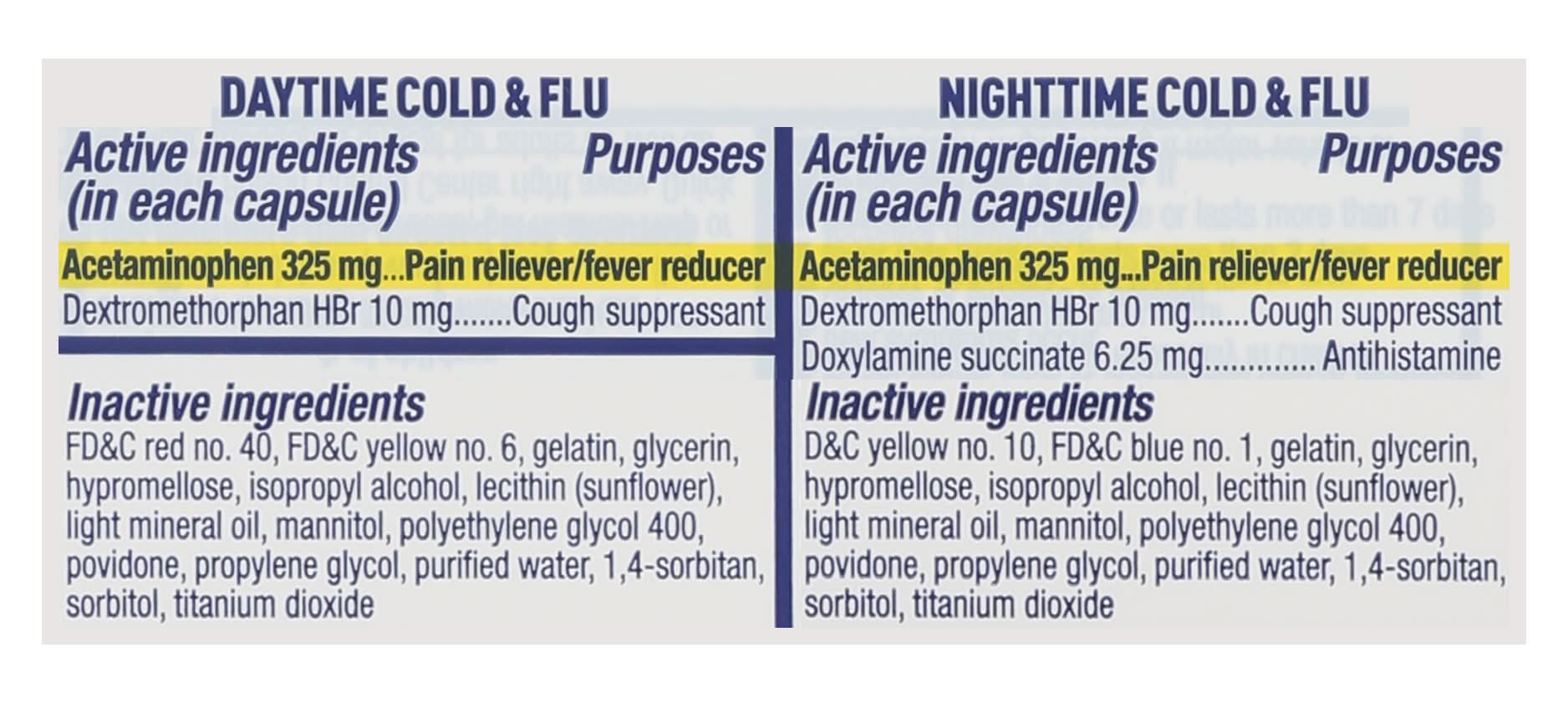 Ingredients: In Each Capsule: Active Ingredients: Acetaminophen (325 mg), Pain Reliever/Fever Reducer; Dextromethorphan HBr (10 mg), Cough Suppressant. Inactive Ingredients: FD&C Red No. 40, FD&C Yellow No. 6, Gelatin, Glycerin, Hypromellose, Isopropyl Alcohol, Lecithin (Sunflower), Light Mineral Oil, Mannitol, Polyethylene Glycol 400, Povidone, Propylene Glycol, Purified Water, 1, 4-Sorbitan, Sorbitol, Titanium Dioxide. In Each Capsule: Active Ingredients: Acetaminophen (325 mg), Pain Reliever/Fever Reducer; Dextromethorphan HBr (10 mg), Cough Suppressant; Doxylamine Succinate (6.25 mg), Antihistamine. Inactive Ingredients: D&C Yellow No.10, FD&C Blue No. 1, Gelatin, Glycerin, Hypromellose, Isopropyl Alcohol, Lecithin (Sunflower), Light Mineral Oil, Mannitol, Polyethylene Glycol 400, Povidone, Propylene Glycol, Purified Water, 1, 4-Sorbitan, Sorbitol, Titanium Dioxide. In Each Capsule: Active Ingredients: Acetaminophen (325 mg), Pain Reliever/Fever Reducer; Dextromethorphan HBr (10 mg), Cough Suppressant. Inactive Ingredients: FD&C Red No. 40, FD&C Yellow No. 6, Gelatin, Glycerin, Hypromellose, Isopropyl Alcohol, Lecithin (Sunflower), Light Mineral Oil, Mannitol, Polyethylene Glycol 400, Povidone, Propylene Glycol, Purified Water, 1, 4-Sorbitan, Sorbitol, Titanium Dioxide. In Each Capsule: Active Ingredients: Acetaminophen (325 mg), Pain Reliever/Fever Reducer; Dextromethorphan HBr (10 mg), Cough Suppressant; Doxylamine Succinate (6.25 mg), Antihistamine. Inactive Ingredients: D&C Yellow No.10, FD&C Blue No. 1, Gelatin, Glycerin, Hypromellose, Isopropyl Alcohol, Lecithin (Sunflower), Light Mineral Oil, Mannitol, Polyethylene Glycol 400, Povidone, Propylene Glycol, Purified Water, 1, 4-Sorbitan, Sorbitol, Titanium Dioxide