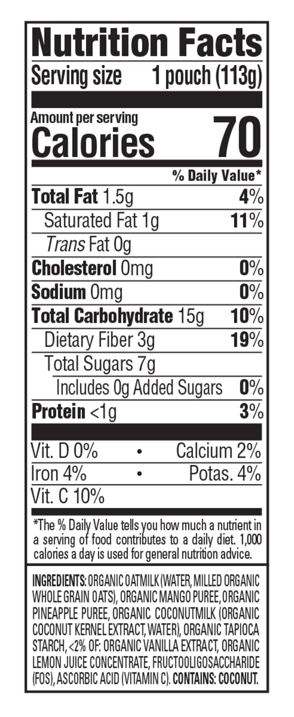Ingredients: Organic Oatmilk (Water Milled Organic Whole Grain Oats) Organic Mango Puree Organic Pineapple Puree Organic Coconutmilk (Organic Coconut Kernel Extract Water) Organic Tapioca Starch, Less than 2% of: Organic Vanilla Extract Organic Lemon Juice Concentrate Fructooligosaccharide (FOS) Ascorbic Acid (Vitamin C) Contains: Oat, coconut