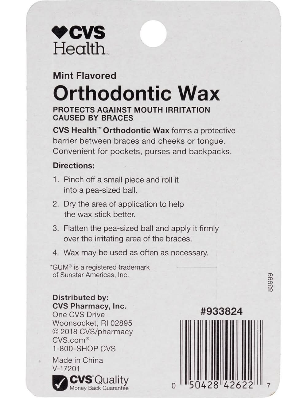 CVS Health Orthodontic Wax forms a protective barrier between braces and cheeks or tongue. Convenient for pockets, purses and backpacks. Soothes mouth irritation caused by braces. Convenient carrying case for on the go. CVS Health quality guarantee. Pack size: 2